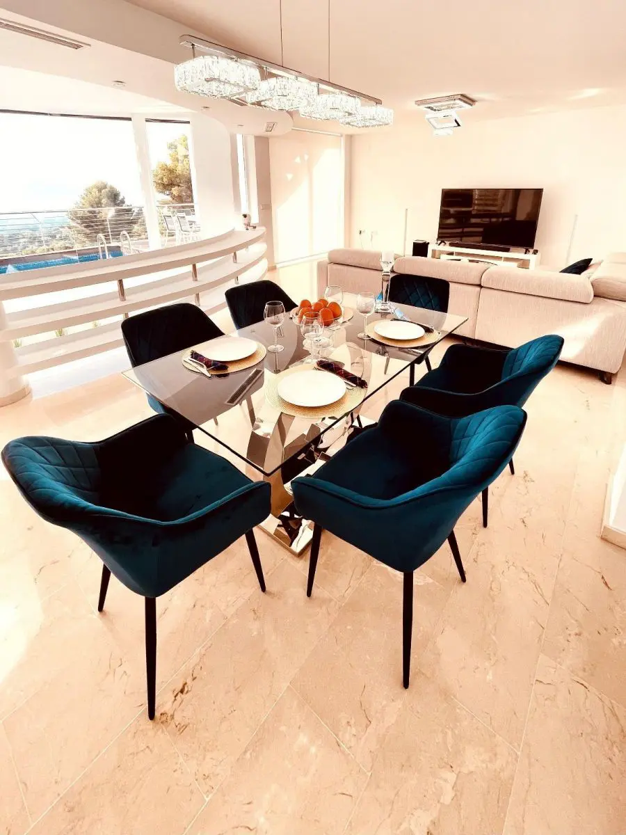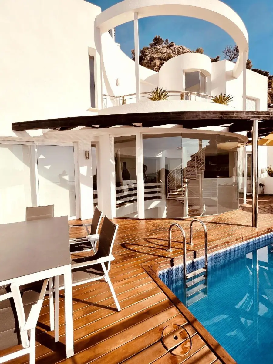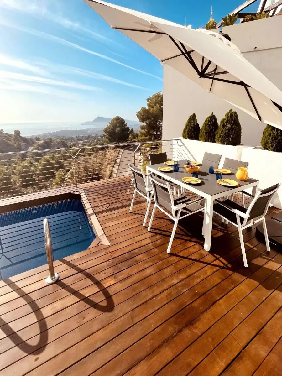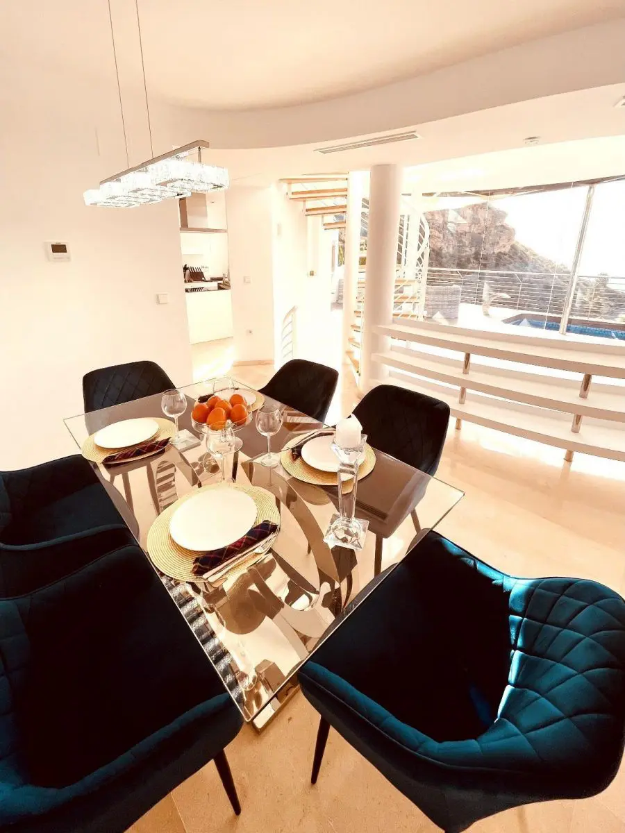 Lujosa Villa en Altea Hills, ALTEART, vive en plena naturaleza con unas vistas panoramicas expectaculares en una urbanización exclusiva en Peñas Rojas, SIERRA ALTEA II.La casa tipo villa consta de 3 plantas. La primera planta con recibidor, a su derecha puerta comunicando al garage, a su izquierda 1 dormitorio que podria ser de invitados o guest room con su propio baño completo. en esa misma planta tambien hay una habitacion de grandes dimensiones que se puede usar y se usa como zona de lavanderia donde se aprecian las paredes como parte de la estructura natural de la roca exterior. si bajamos a la planta intermedia por sus escaleras de caracol o por el ASCENSOR integrado en la casa, accedemos a un amplisimo salón donde se puede apreciar la arquitectura expectacular de la casa con cocina independiente. Desde esa miama planta se encuentra el acceso a una terraza con suelo de madera, mesa, diferentes sillones y mobiliario de piscina y piscina independiente. La terraza cuenta con una moderna barbacoa para poder disfrutar del sol y comer al aire libre con unas de las mejorers vistas de la Costa Blanca. Bajamos a la tercera planta donde encontraremos 3 habitaciones tipo suite con baño completo y en una de ellas con jacuzzi. todas las habitaciones tienen la misma orientación y vistas a el mar y la naturaleza.La casa tiene incorporada domotica de última generación, donde podras controlar la temperatura de cada habitación, subir o bajar persianas o controlar la iluminacion.Urbanización exclusiva con puerta de acceso con cámaras.