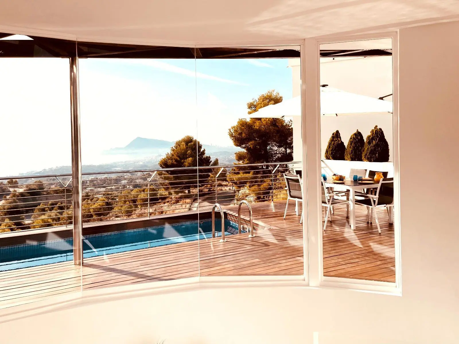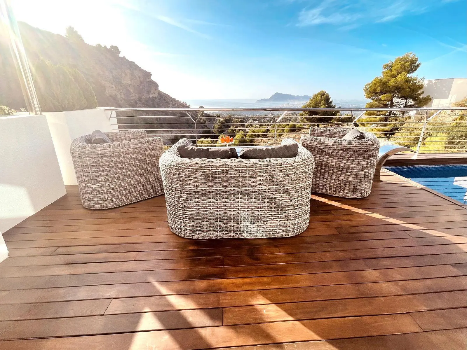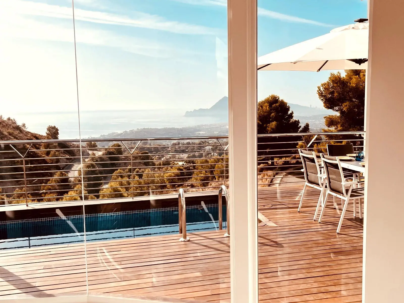 Lujosa Villa en Altea Hills, ALTEART, vive en plena naturaleza con unas vistas panoramicas expectaculares en una urbanización exclusiva en Peñas Rojas, SIERRA ALTEA II.La casa tipo villa consta de 3 plantas. La primera planta con recibidor, a su derecha puerta comunicando al garage, a su izquierda 1 dormitorio que podria ser de invitados o guest room con su propio baño completo. en esa misma planta tambien hay una habitacion de grandes dimensiones que se puede usar y se usa como zona de lavanderia donde se aprecian las paredes como parte de la estructura natural de la roca exterior. si bajamos a la planta intermedia por sus escaleras de caracol o por el ASCENSOR integrado en la casa, accedemos a un amplisimo salón donde se puede apreciar la arquitectura expectacular de la casa con cocina independiente. Desde esa miama planta se encuentra el acceso a una terraza con suelo de madera, mesa, diferentes sillones y mobiliario de piscina y piscina independiente. La terraza cuenta con una moderna barbacoa para poder disfrutar del sol y comer al aire libre con unas de las mejorers vistas de la Costa Blanca. Bajamos a la tercera planta donde encontraremos 3 habitaciones tipo suite con baño completo y en una de ellas con jacuzzi. todas las habitaciones tienen la misma orientación y vistas a el mar y la naturaleza.La casa tiene incorporada domotica de última generación, donde podras controlar la temperatura de cada habitación, subir o bajar persianas o controlar la iluminacion.Urbanización exclusiva con puerta de acceso con cámaras.