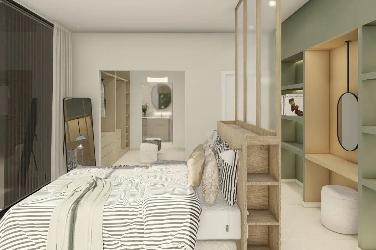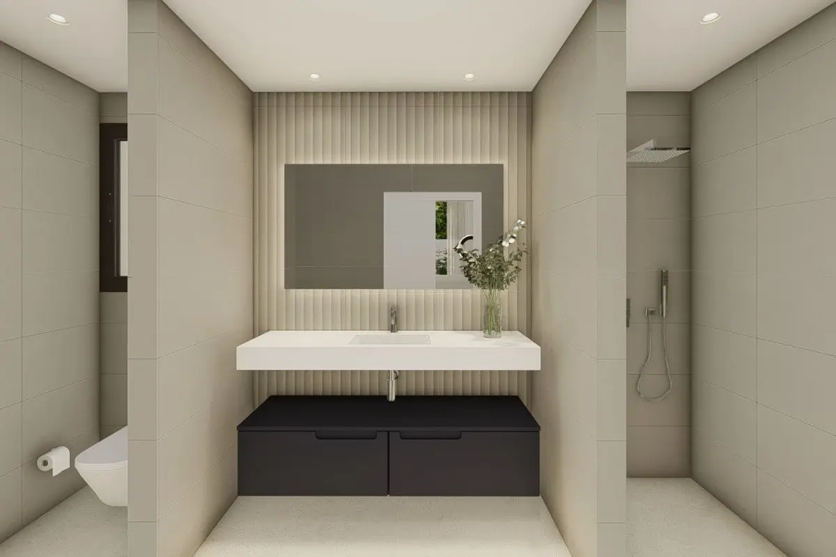 Each villa includes three double bedrooms, each with fitted wardrobes. There are also three family bathrooms. The kitchen is modern, and the living and dining area is an open space connected to a private pool and garden. These areas offer panoramic views.