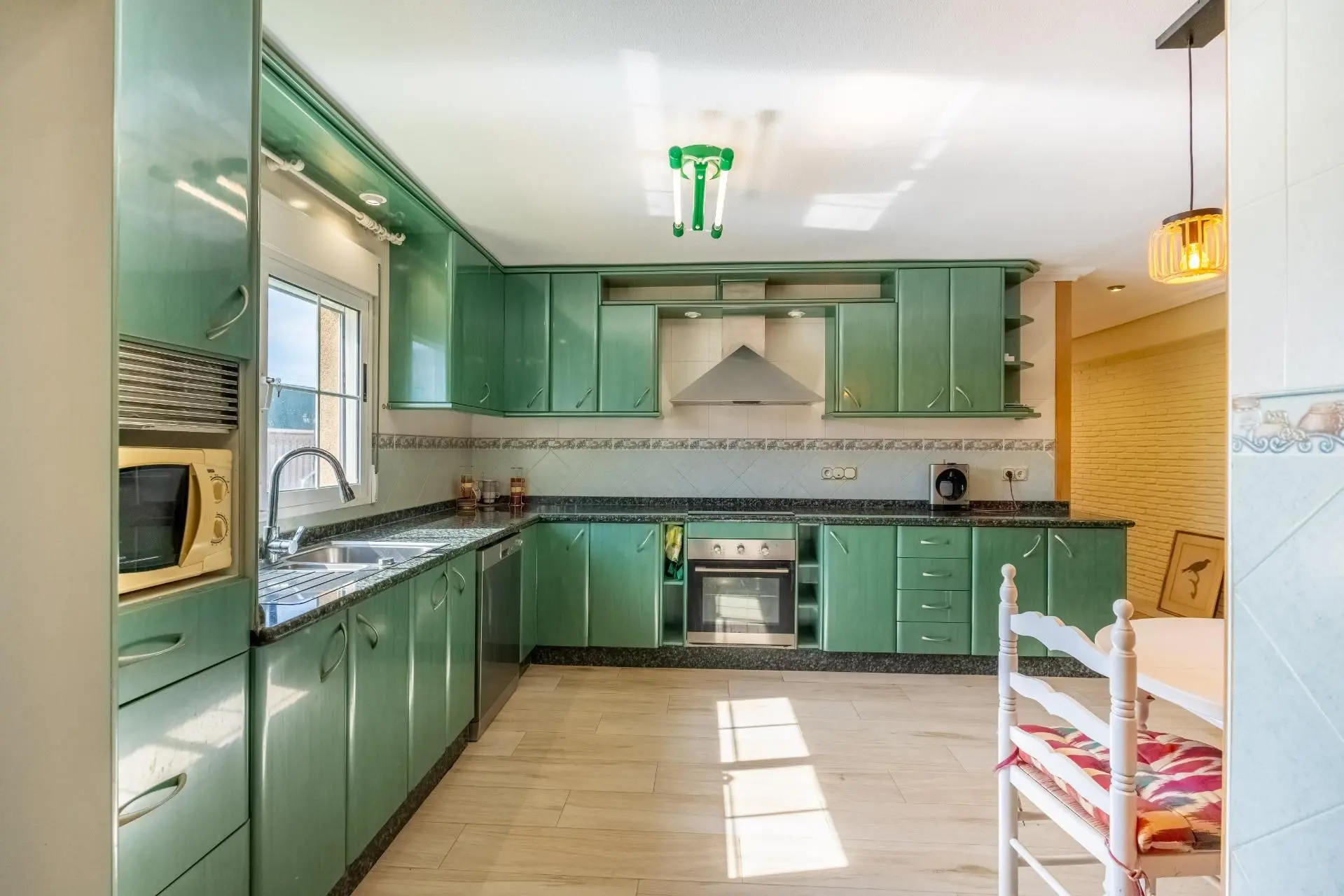 I present this huge villa in Chaparral. Chaparral is one of the best areas of Torrevieja if you’re looking for quality of life, tranquility, and comfort, without sacrificing essential services. Torrevieja is a coastal city located on the Costa Blanca. It’s a tourist area, known for its multitude of beaches and sunny climate. In this villa, you’ll live a life of luxury: its immense garden with a pool, a summer kitchen with a fireplace, barbecue, and a lounge area will make your summers unforgettable. But what makes this house stand out is that it has: a movie theater with a giant screen, a wine cellar for wine lovers, a bar with a counter and chairs, perfect for entertaining friends, and an office where you can work in a comfortable space. It also has a closed garage for several cars.