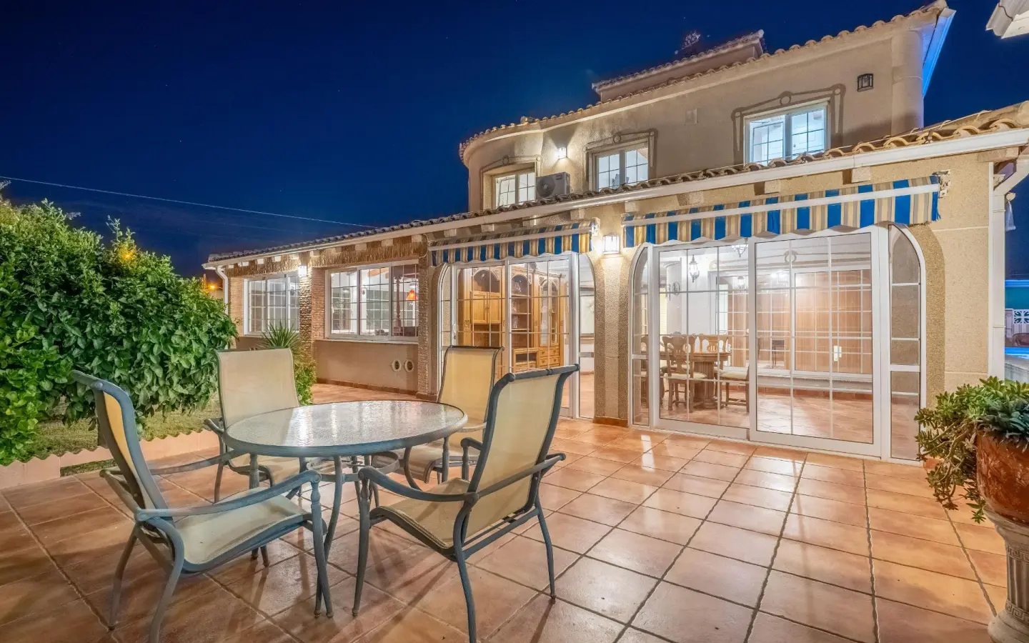 I present this huge villa in Chaparral. Chaparral is one of the best areas of Torrevieja if you’re looking for quality of life, tranquility, and comfort, without sacrificing essential services. Torrevieja is a coastal city located on the Costa Blanca. It’s a tourist area, known for its multitude of beaches and sunny climate. In this villa, you’ll live a life of luxury: its immense garden with a pool, a summer kitchen with a fireplace, barbecue, and a lounge area will make your summers unforgettable. But what makes this house stand out is that it has: a movie theater with a giant screen, a wine cellar for wine lovers, a bar with a counter and chairs, perfect for entertaining friends, and an office where you can work in a comfortable space. It also has a closed garage for several cars.