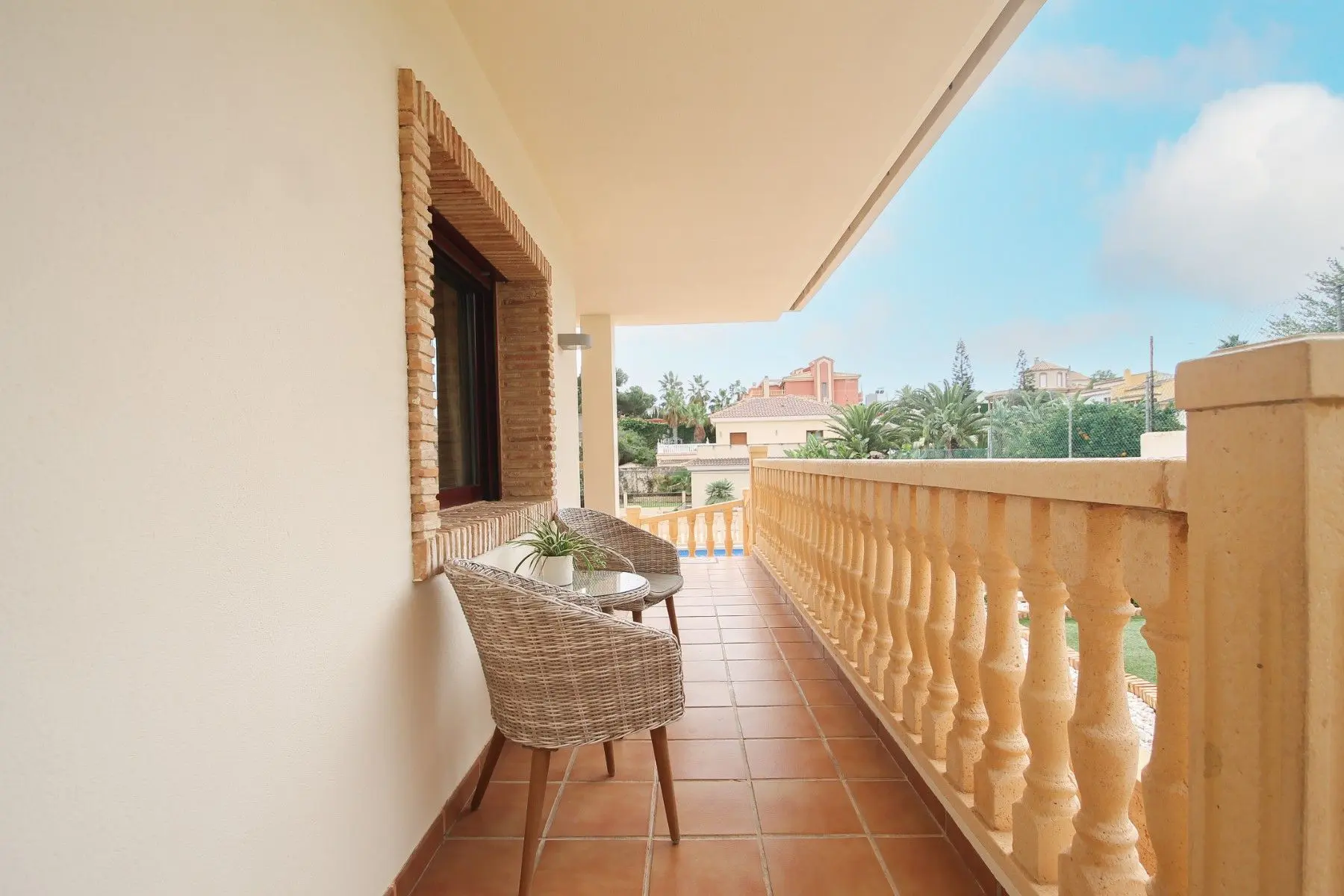 The exterior features a well-maintained garden, private pool, barbecue area, and a porch with seating. Perfect for enjoying the Mediterranean climate year-round in total privacy and comfort.
