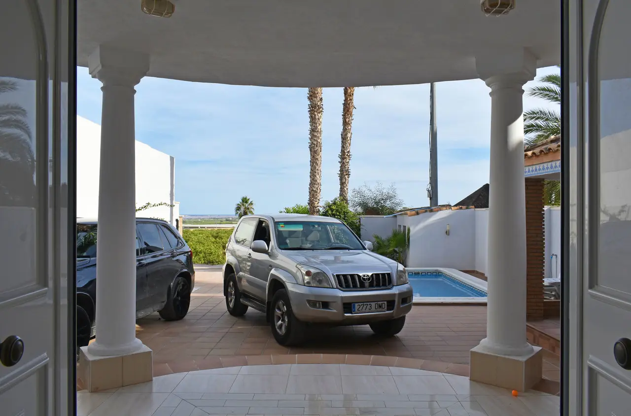 Fantastic spacious villa in green surroundings with proximity to popular golf courses. The location is quiet, private and offers fantastic views of orange groves, the salt lake and the Mediterranean!We reach the property via a pedestrians gate or a wider gate to park the car on the plot. At the front there is a very spacious terrace with pool. We enter the house and arrive in a bright, spacious living room with open plan dining area. Right in front of us we find the separate well-equipped kitchen. On this floor there are also two bedrooms, two bathrooms and laundry room.We go upstairs and find another 3-4 bedrooms and 3 bathrooms. The main bedroom has a jacuzzi, walk-in shower, toilet and balcony with stunning views.Upstairs we find the roof terrace and another room.
