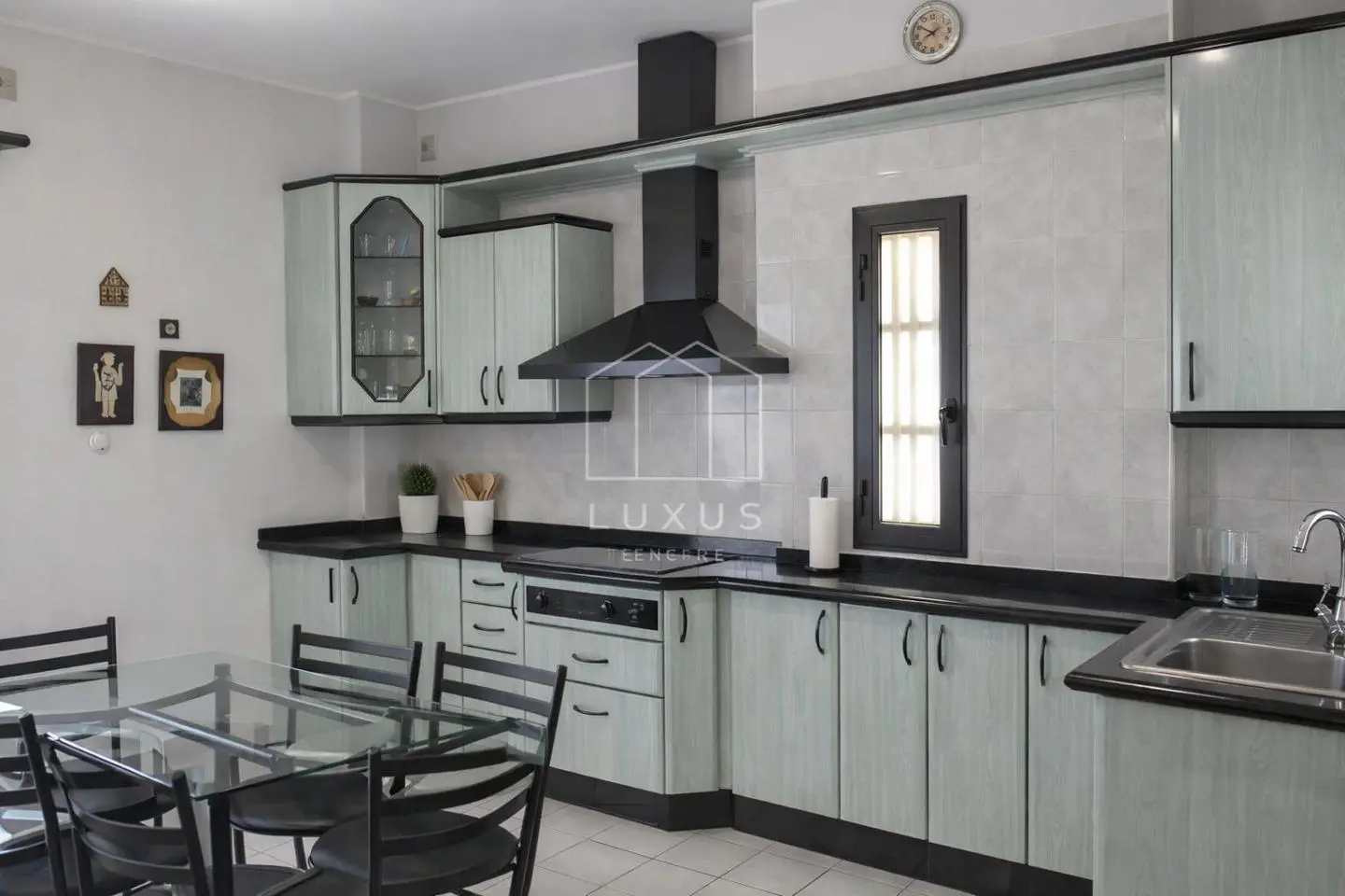 The house features a separate, fully equipped kitchen and a large, light-filled living area, with an internal staircase linking both levels. Comfort is ensured year-round with air conditioning, and the property is further complemented by a security alarm system.