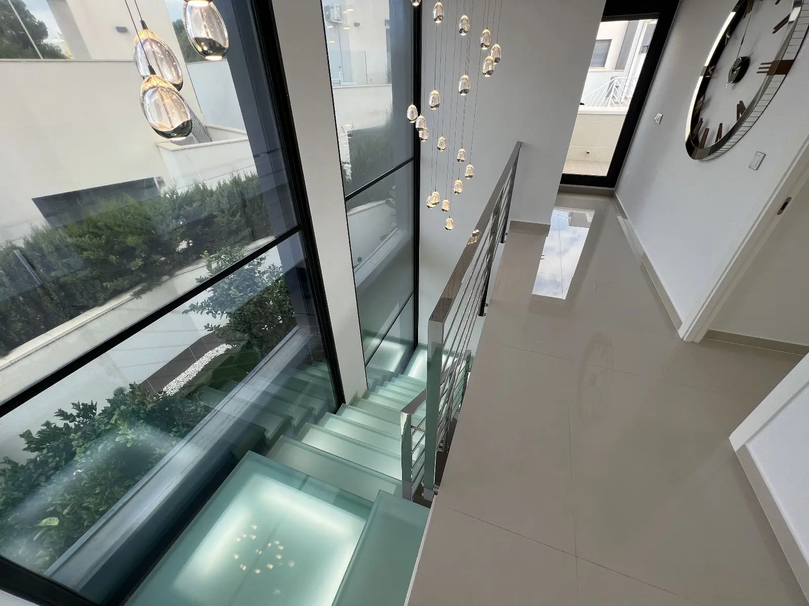 This luxurious modern villa spans three levels and features 5 bedrooms and 4 bathrooms, with a stunning glass staircase with built-in LED accent lighting and a convenient commercial elevator that seamlessly connects all floors. Nestled in the Las Comunicaciones neighborhood, the property is perched on a hill, offering open views of the salt lake and coastline beyond. It’s just a 2-3 minute drive to the town center of San Miguel de Salinas, while Villamartin / Orihuela Costa are only 7 minutes away, providing easy access to all the amenities and attractions of the Costa Blanca South coastline.