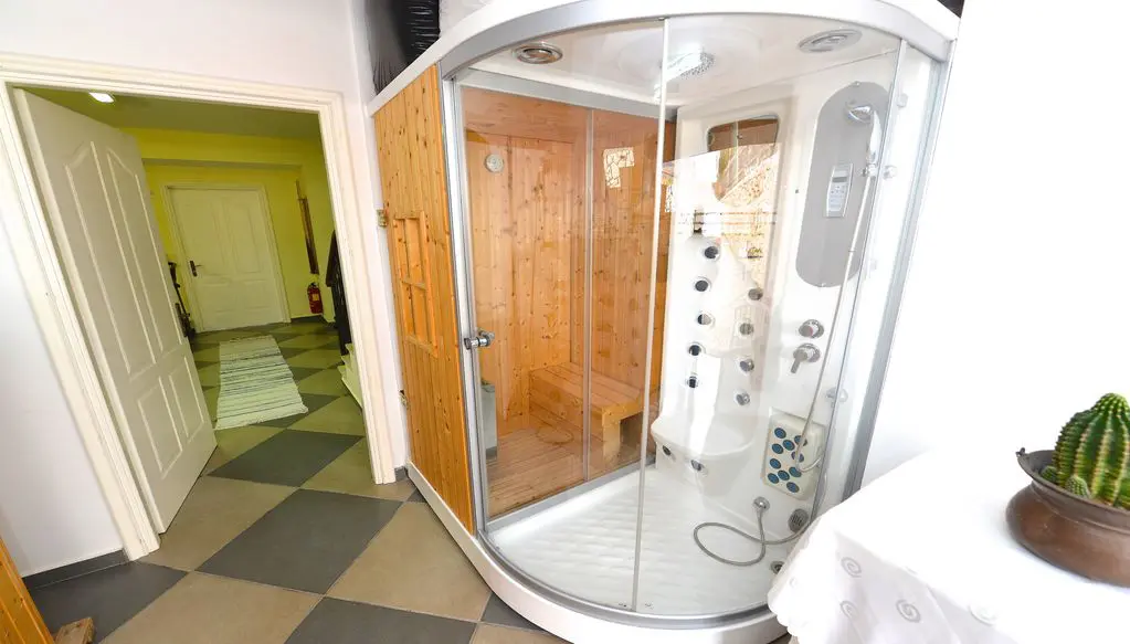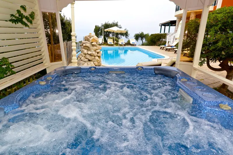 The first floor expands further, showcasing three bedrooms and three bathrooms, along with a hot tub ready for use. This arrangement allows for privacy and convenience, especially with multiple bathrooms available.