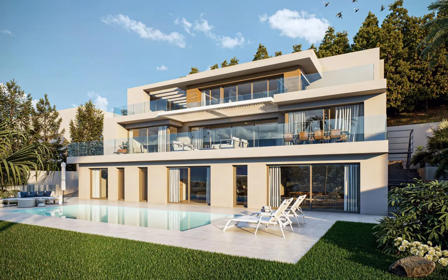 The exterior design of this villa encourages full enjoyment of the Mediterranean climate. The private garden is perfect for relaxing or engaging in outdoor activities, while the terrace becomes the best spot to contemplate the sea views and enjoy sunsets. A solarium provides total privacy for sunbathing, and the private pool adds a refreshing touch during the hottest days.
