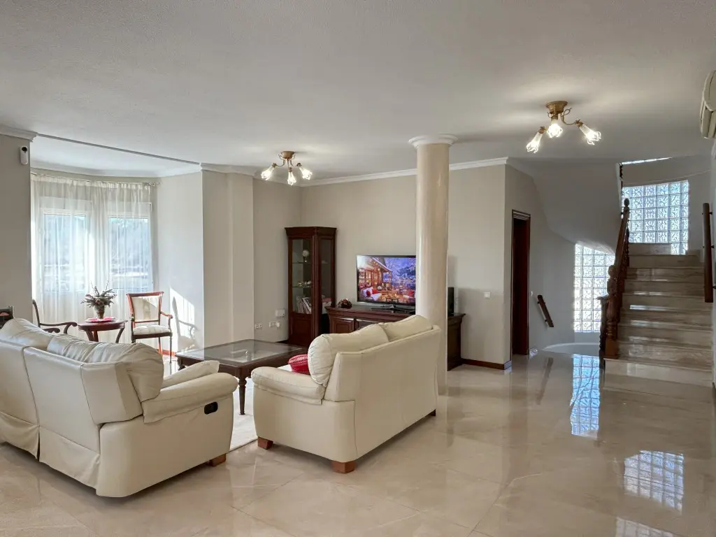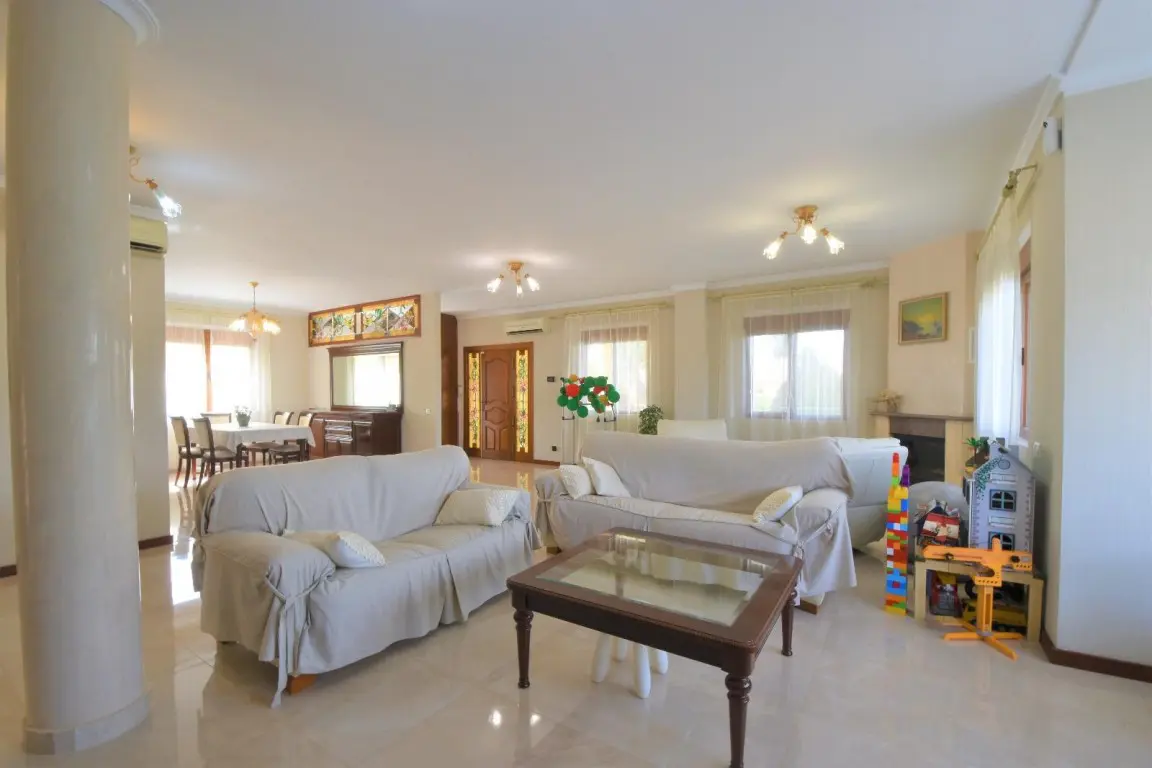 Upon entering, you are greeted by a 30 m² front terrace that provides a great outdoor space for enjoying the Mediterranean climate. The living room is designed to be both spacious and bright, featuring separate areas for a fireplace, a TV, and dining. The kitchen is equipped with all necessary appliances, complete with custom-made solid cherry wood cabinets that integrate well into the overall design. From the kitchen, there is access to a patio intended for barbecues and outdoor dining.
