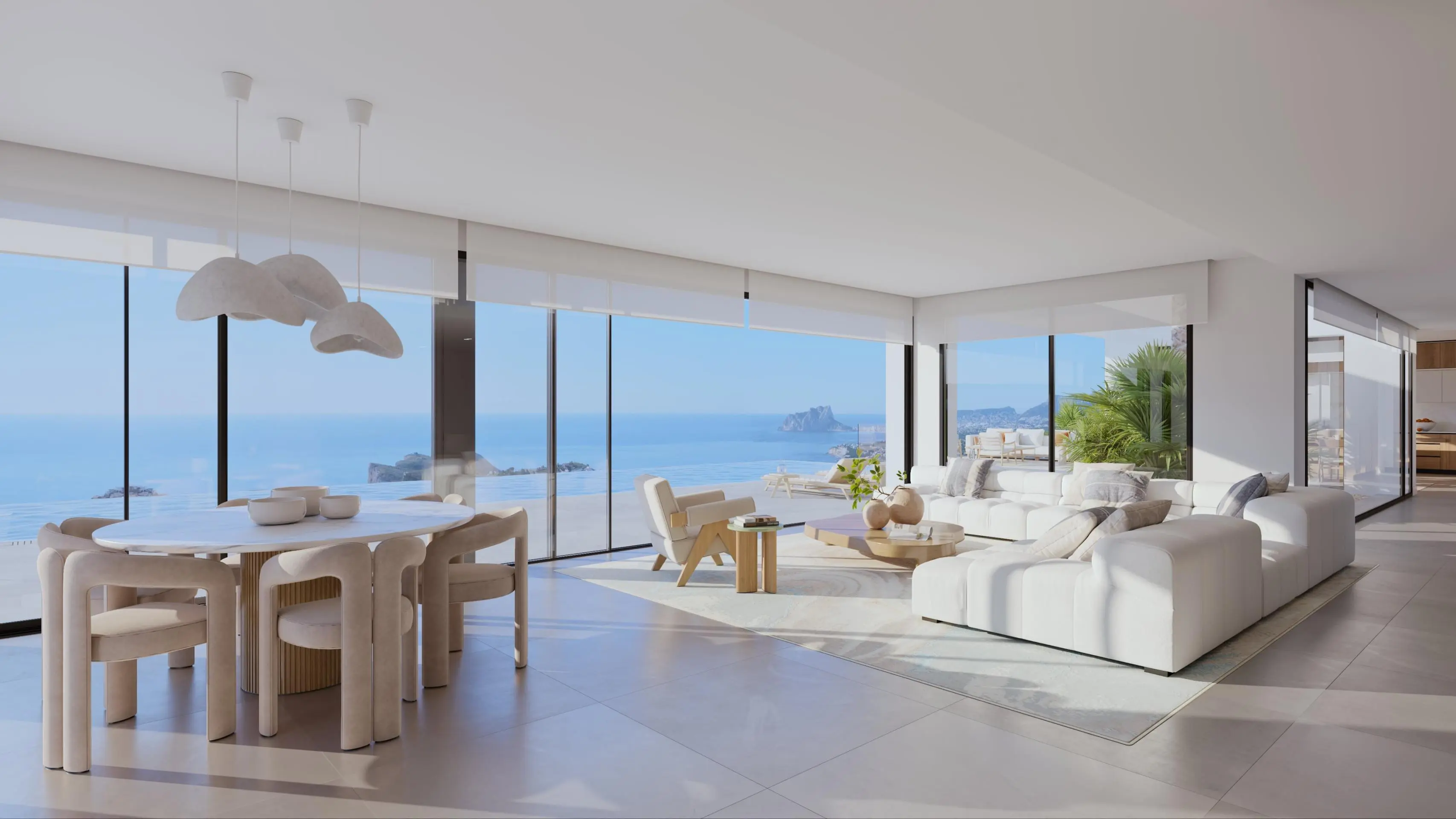 The interior of the home has been designed with noble materials, soft tones, and careful natural lighting. The living room is spacious, with several seating areas, and visually connects with the dining room and kitchen. All of this is in an open space that enhances breadth and brightness. The night area, located on the upper floor, includes bedrooms with direct access to private terraces, where waking up to the sound of the sea becomes an everyday luxury.
