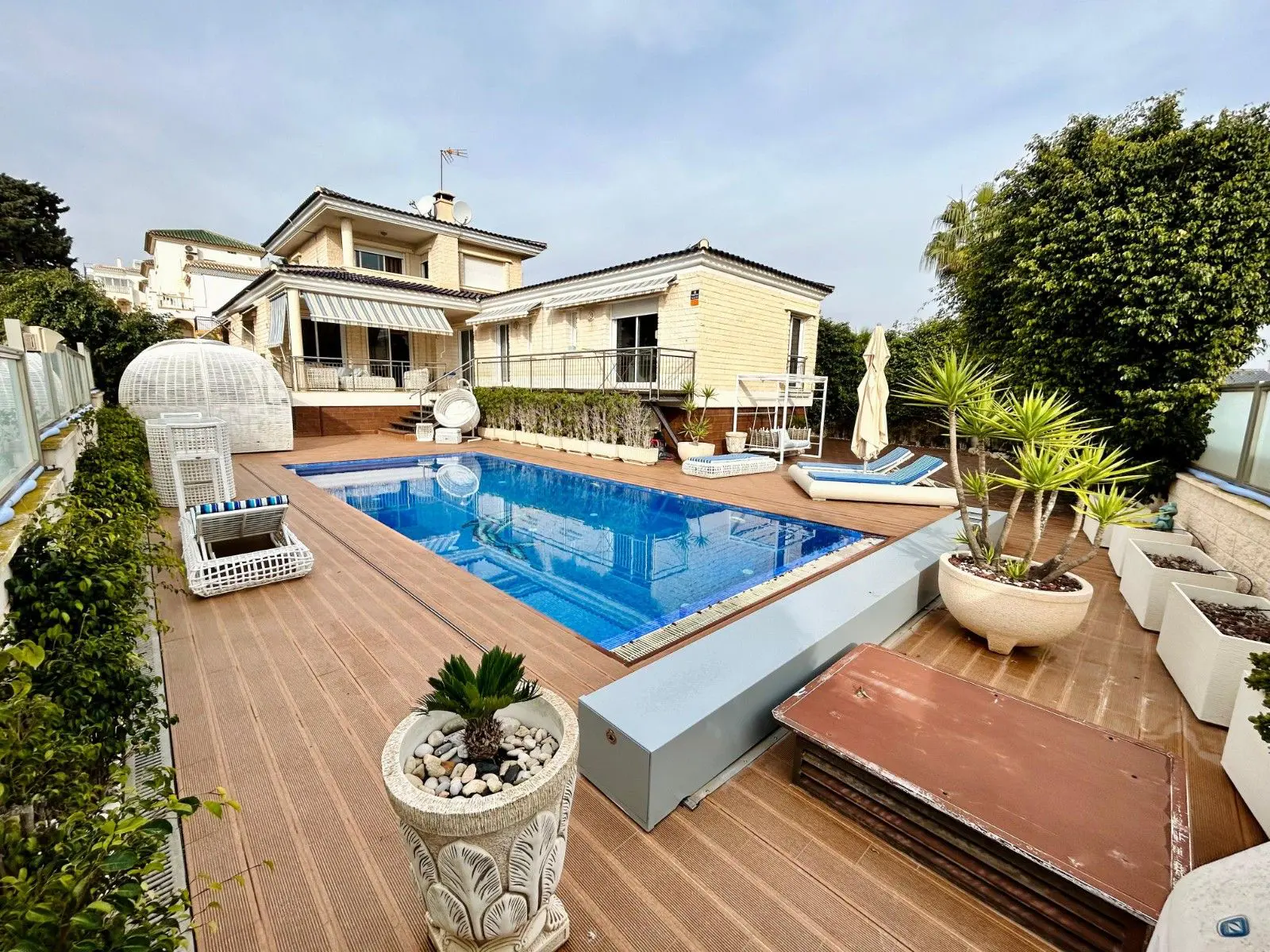 Luxury villa for sale near the sea in La Mata, Costa Blanca, Spain. A spacious modern house with an area of 469 m2 has a plot of 790 m2, on which there is a heated swimming pool with a relaxation area, parking and a barbecue area. The villa itself is built on several levels and has 5 bedrooms and 4 bathrooms, each of which is designed in its own unique style and equipped with everything necessary for comfort.