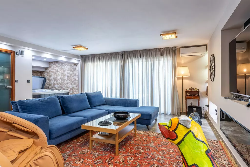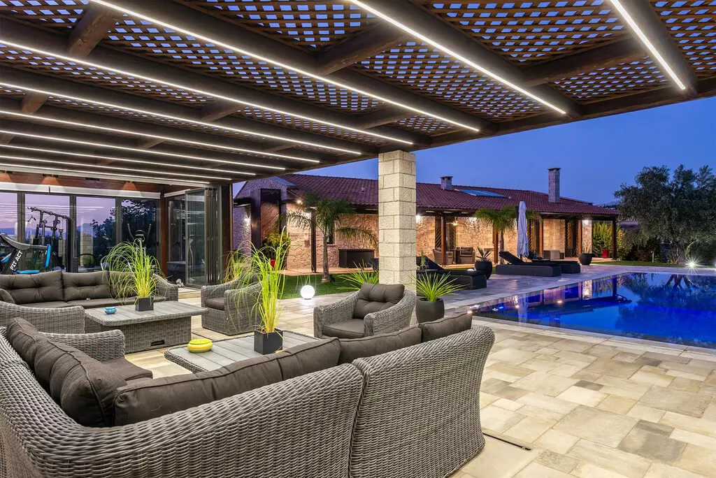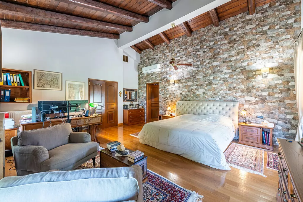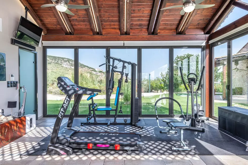 This villa is equipped with a range of amenities for practical living. Additional rooms include an office, a gym, and a storeroom, providing flexibility for various lifestyle requirements. The villa also boasts a hot tub, adding to its appeal as a recreational space.