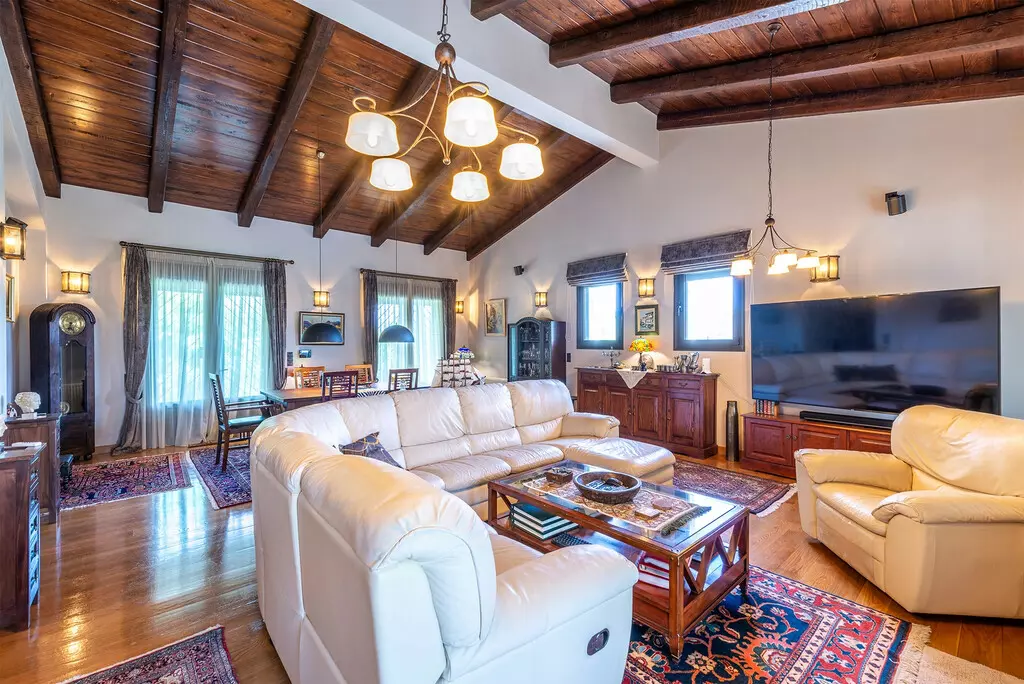 Located in the heart of Peloponnese, this 1-storey villa spans an expansive 471 square meters. The property features four bedrooms, offering ample space for residents or guests. With three living rooms, three kitchens, and five shower WCs, the home is designed to accommodate both daily living and entertainment needs.