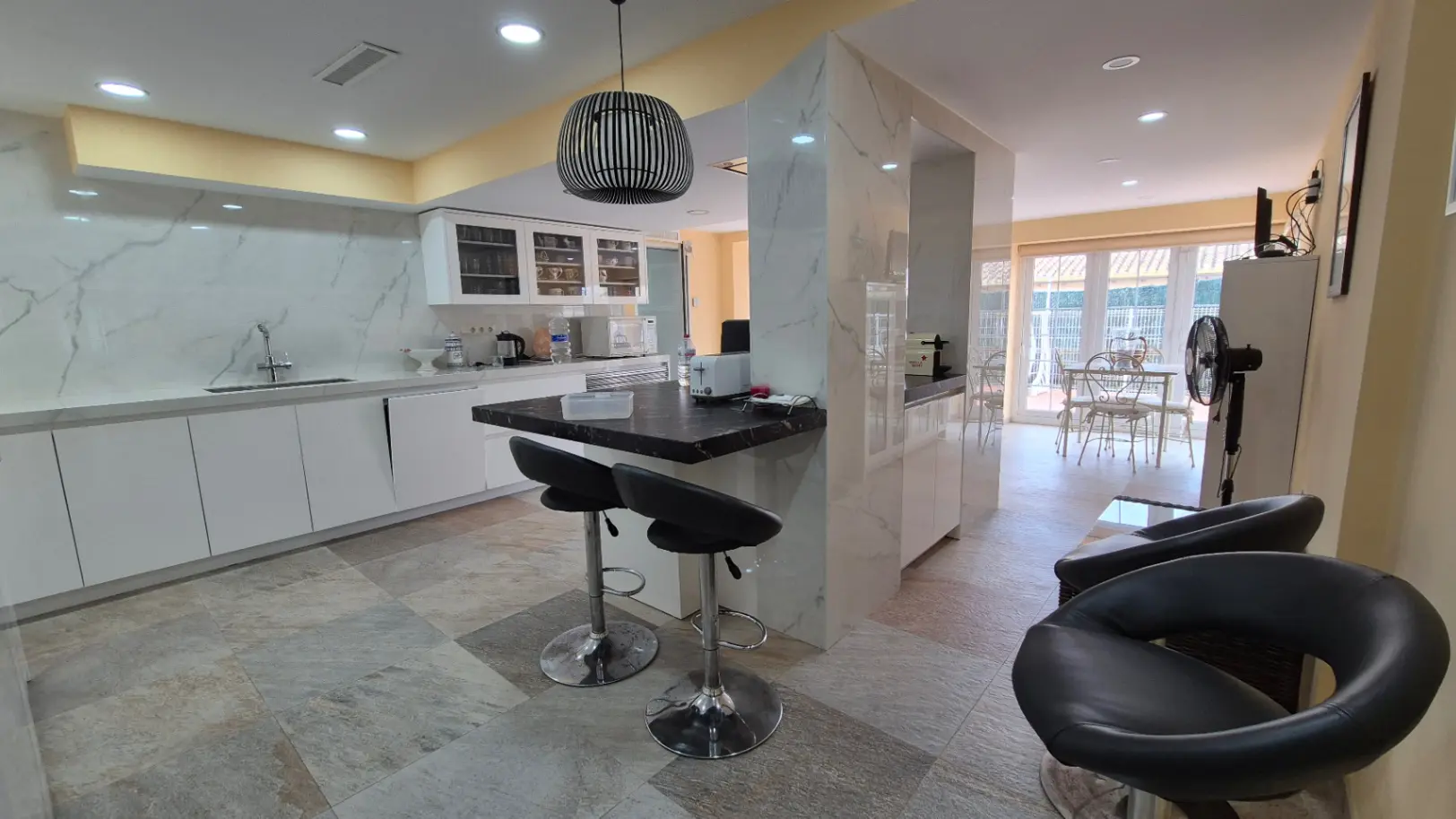 A key highlight of this property is the enclosed pool area. This space not only provides a place for swimming but also includes a meeting area for dining and gatherings. The roof offers protection while still maintaining an open feel, creating an atmosphere suitable for dining al fresco while taking in the surroundings.