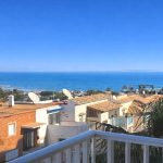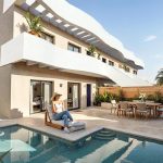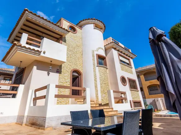 A terrace surrounds the property and provides access to a staircase leading to a private solarium. This solarium offers panoramic views and is suitable for various outdoor activities. The villa itself has a built area of 70 square meters on a plot of approximately 175 square meters. Residents have access to a communal swimming pool with seating areas. Local amenities, such as a commercial center with bars, restaurants, and shops, are within walking distance. Neighboring properties show that there is also space available on the ground floor terrace to install a private swimming pool.