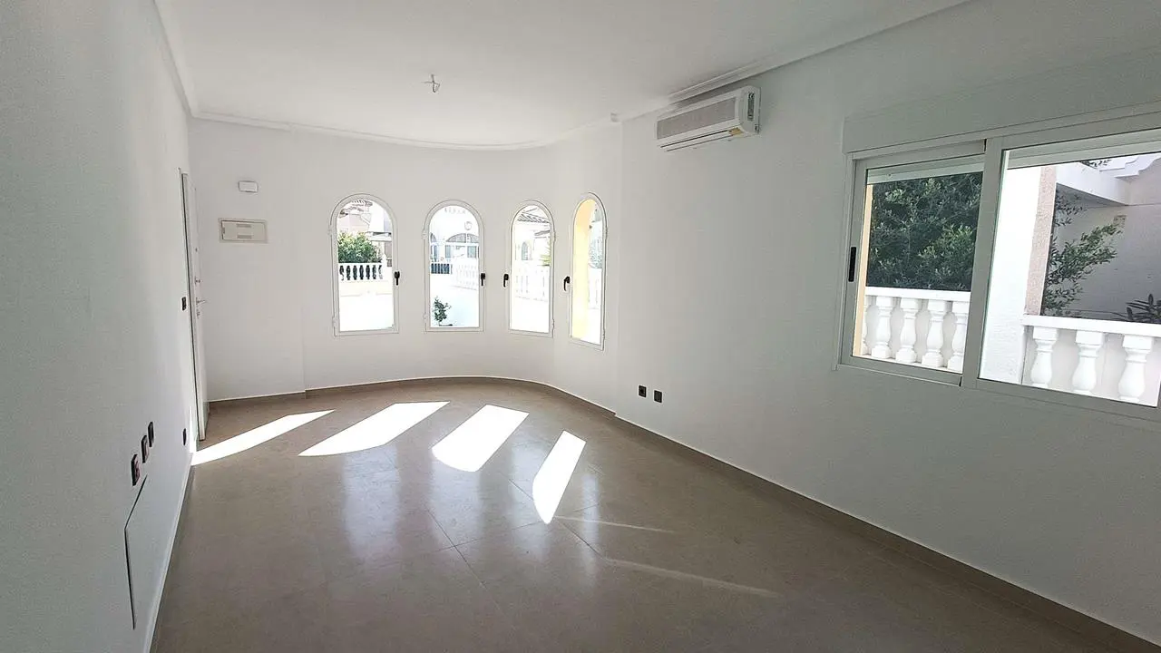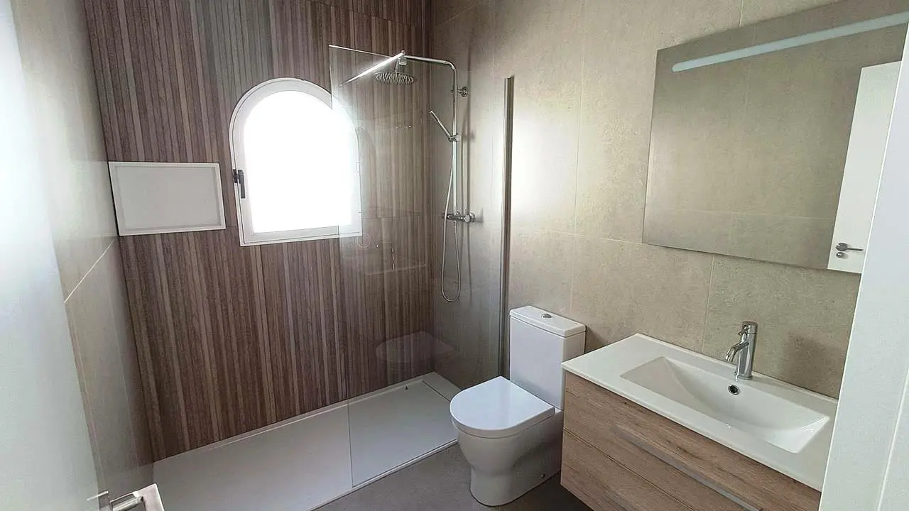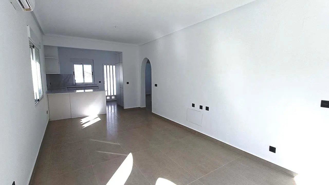 The main living areas are situated on a single level, which has recently undergone renovation. This allows for customization by the new owners. Upon entering the villa, you’ll find a living and dining space that receives abundant natural light through large windows. The kitchen is equipped and ready for use. There are two bedrooms, both with fitted wardrobes, and a bathroom that includes a walk-in shower.