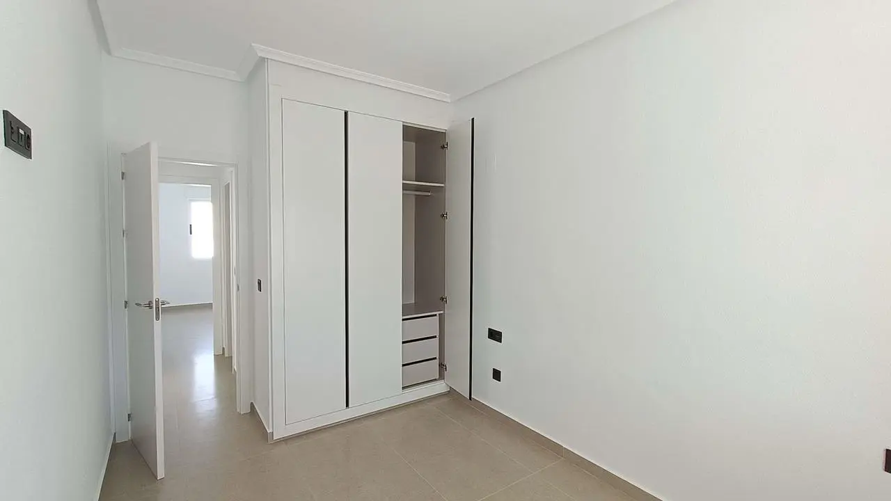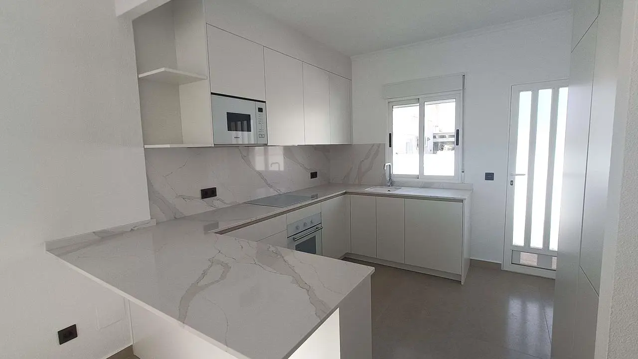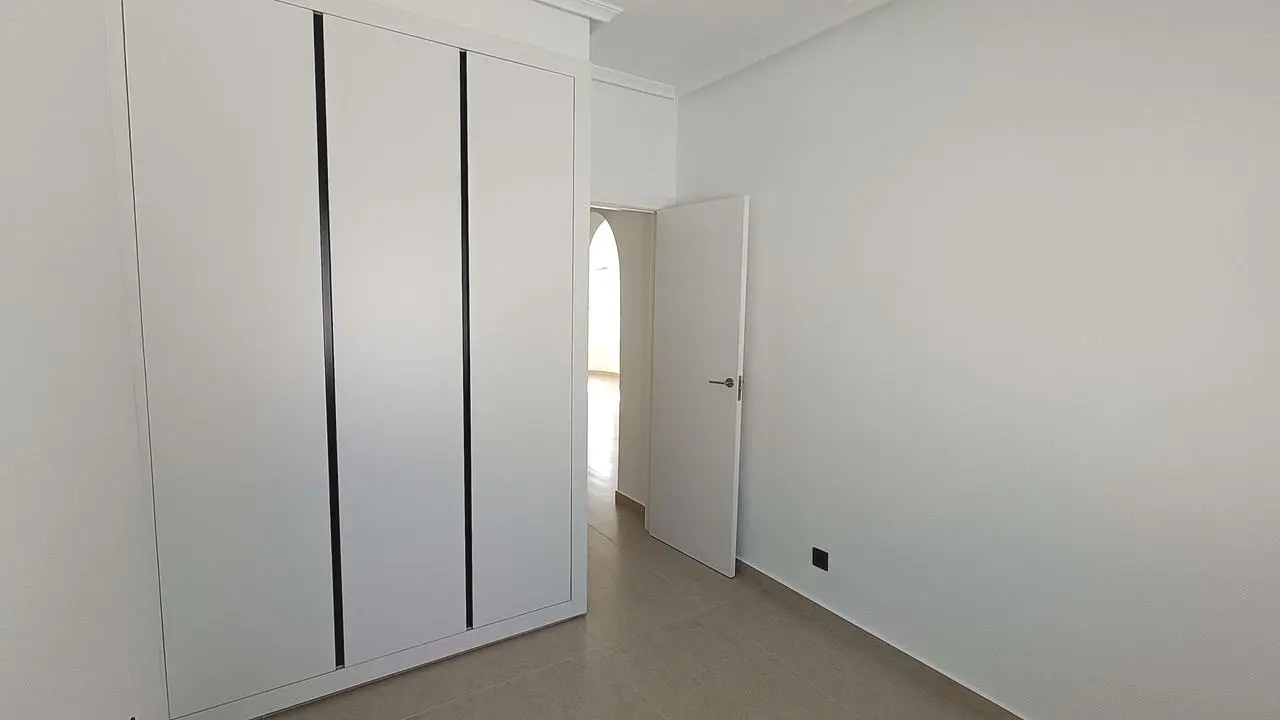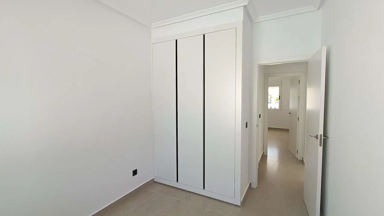 The main living areas are situated on a single level, which has recently undergone renovation. This allows for customization by the new owners. Upon entering the villa, you’ll find a living and dining space that receives abundant natural light through large windows. The kitchen is equipped and ready for use. There are two bedrooms, both with fitted wardrobes, and a bathroom that includes a walk-in shower.