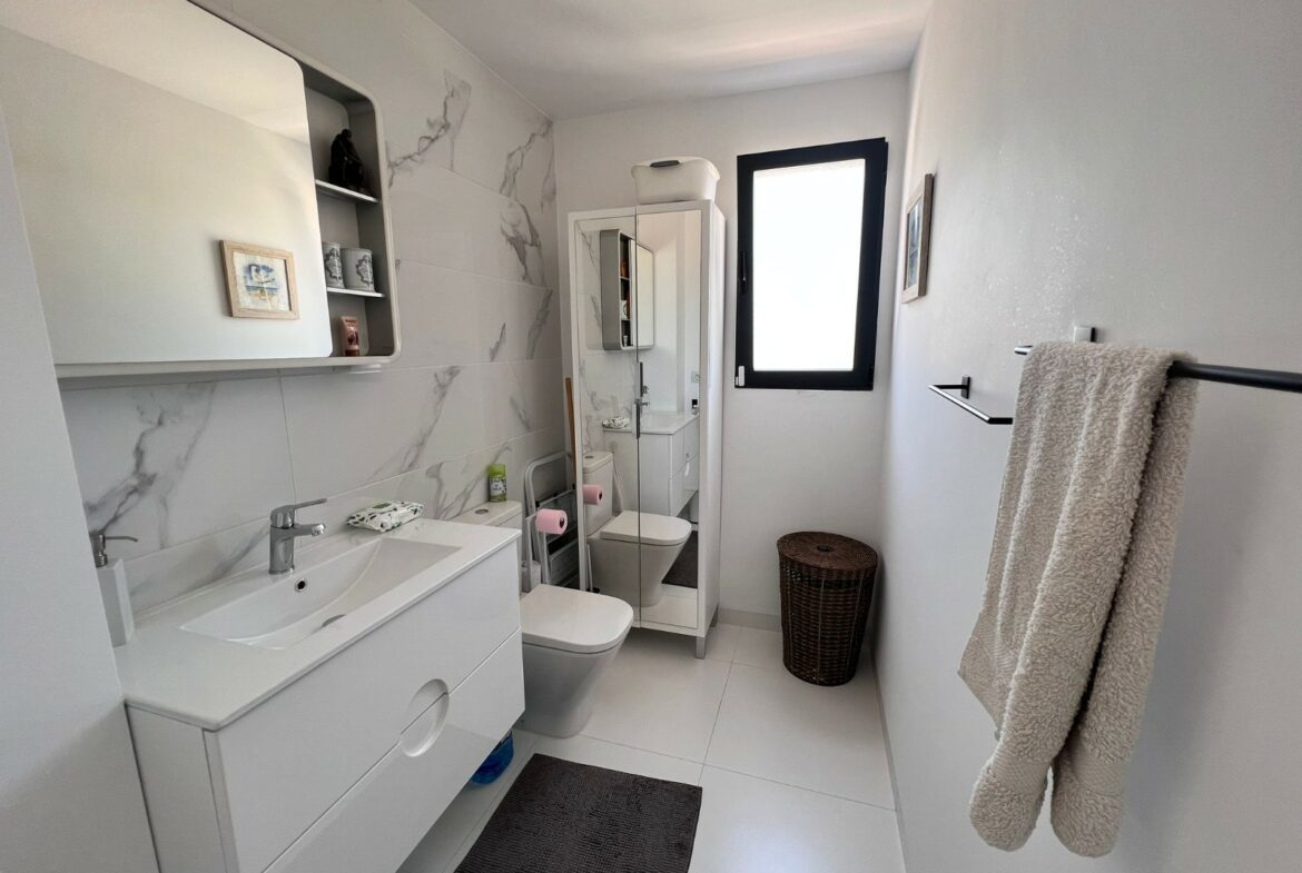 This apartment spans a living area of 70 m². It includes two bedrooms equipped with fitted wardrobes, one complete bathroom, and an additional toilet. The open kitchen is fully equipped, allowing for immediate use. The living room is bright and features access to a private terrace, offering outdoor space for various activities.
