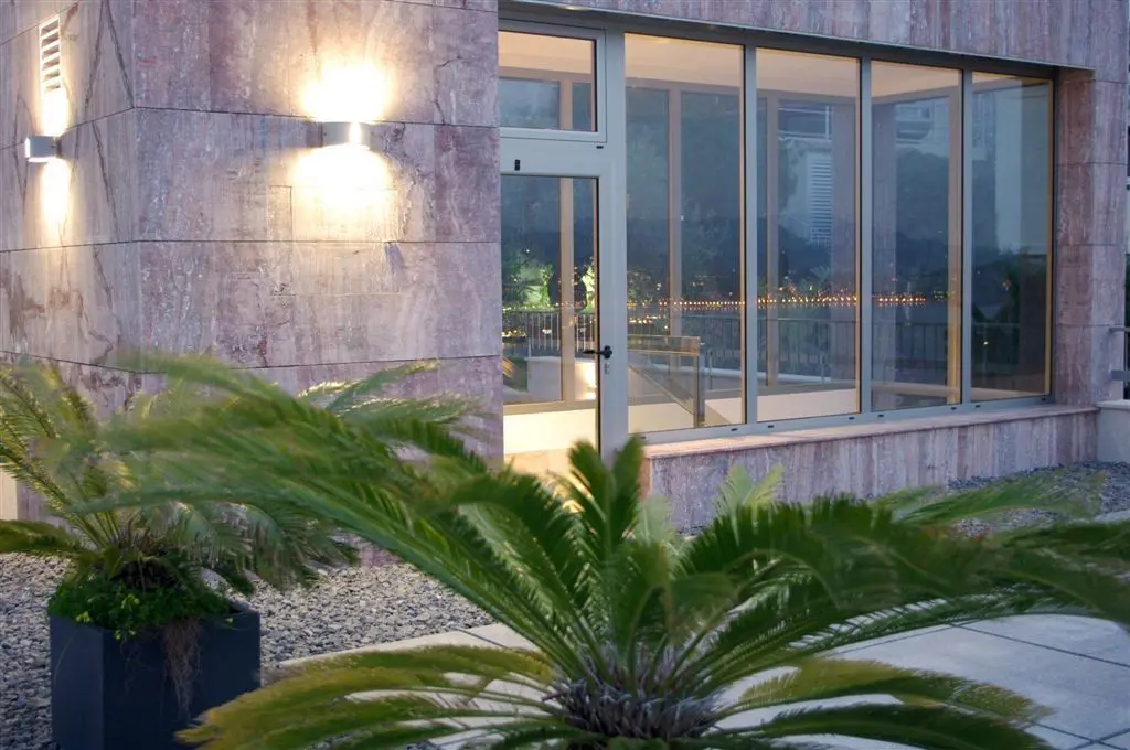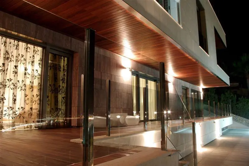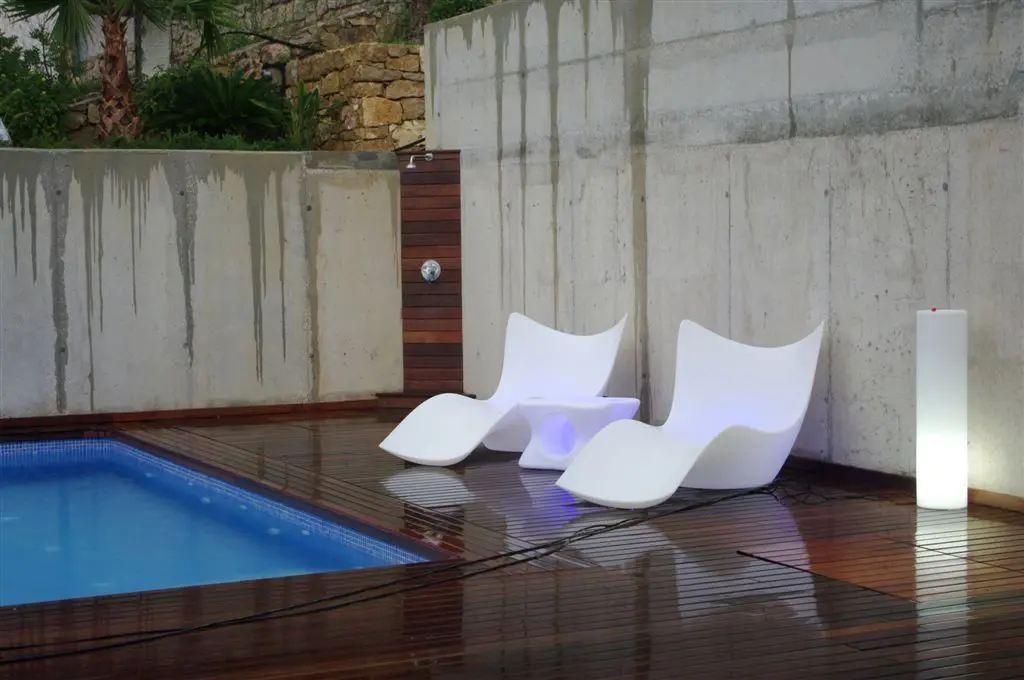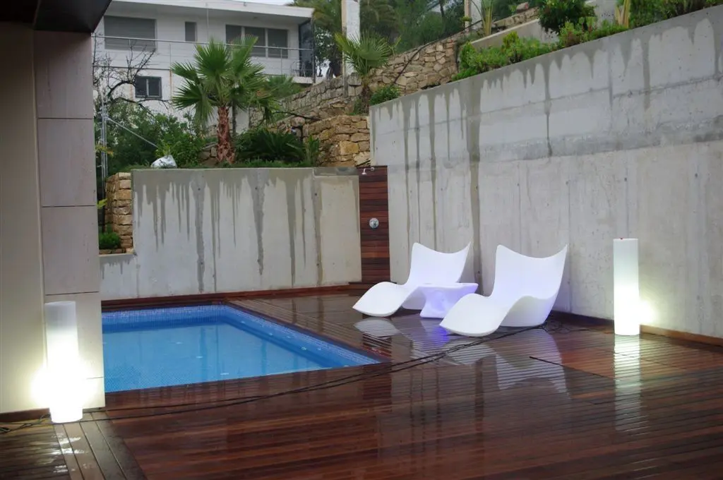 Outside, there is a landscaped area with lighting, automatic irrigation, and an infinity pool with both fresh and saltwater, featuring a self-cleaning system and electrolysis. The garage is approximately 90 m2, with a motorized door and capacity for 3-4 cars, as well as storage space.