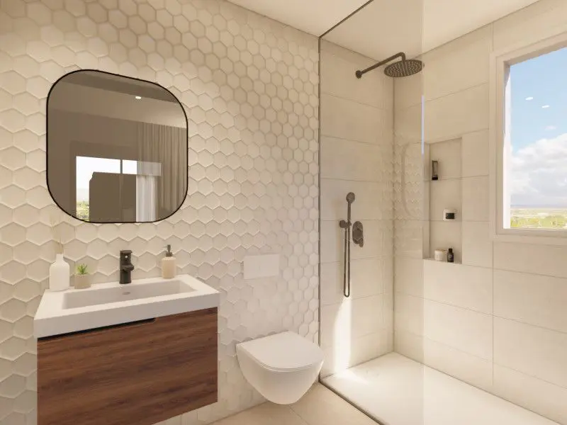 Each of these villas has been designed with your comfort in mind. You’ll discover three bedrooms spread across the two levels of the property. Accompanying these are three bathrooms, each one being an en-suite, meaning direct access from the bedroom. The ground floor welcomes you into an open-plan living area. This space cleverly combines a sizable living room with a streamlined kitchen. The design here focuses on creating a seamless flow, making it easy to entertain guests or simply relax after a long day.