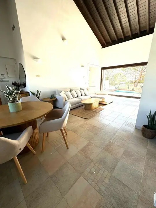 DETAILS – These contemporary designed two bedroom villas have high wooden ceilings and a large open plan lounge/dining room with air conditioning, gas central heating and a wood burner, making it ideal for either summer or winter. They have large concertina doors that lead directing to the outside tiled terrace which overlooks the private pool and garden area. Both the bedrooms have built in wardrobes with one being on-suite. The kitchen is a good size and very stylish with good quality appliances fitted, leading to an outside storage area. The front of the villa is low maintenance with a seating area and carport with an electric entrance gate.