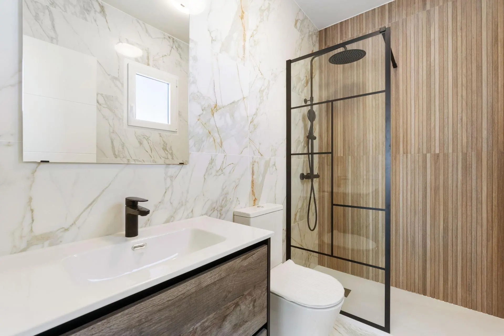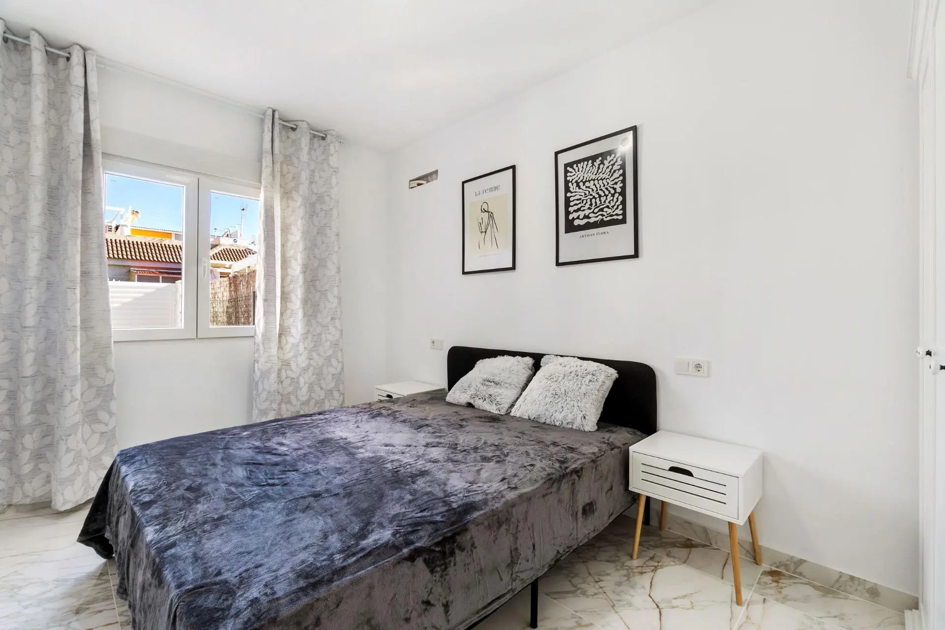 Newly renovated semi-detached villa in El Chaparra, located within a short drive of shops, bars, restaurants, supermarkets and the city of Torrevieja. It is separated into two houses with independent access. On the ground floor we have a house of 54m2 of area, consisting of 2 bedrooms, a bathroom, living-dining room, open-plan kitchen. On the first floor an apartment with its independent entrance, of about 35m2, consisting of 1 double bedroom, living room, has its own kitchen and bathroom; with a large terrace with views of the surroundings. The comprehensive reform was recently carried out with quality materials and modern interior design. Underfloor heating in the bathrooms. Sold with brand new furniture and appliances. Parking space for the car on the plot.This villa offers a harmonious combination of comfort and style.