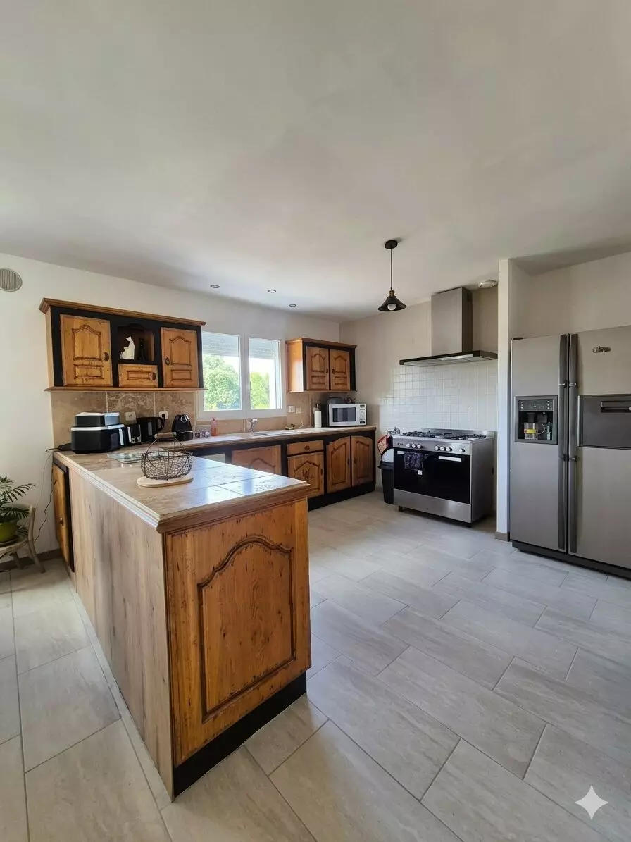 The living area is a large, through-room that opens onto a sunny terrace and the pool area, making it a great space for gatherings. The kitchen is equipped with a cooking range and an American-style refrigerator, making it suitable for those who enjoy cooking.