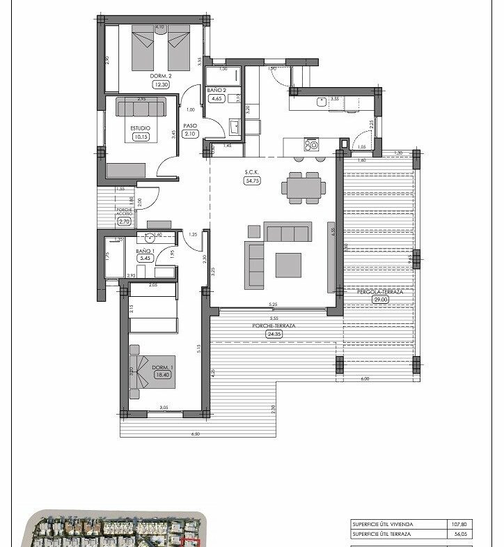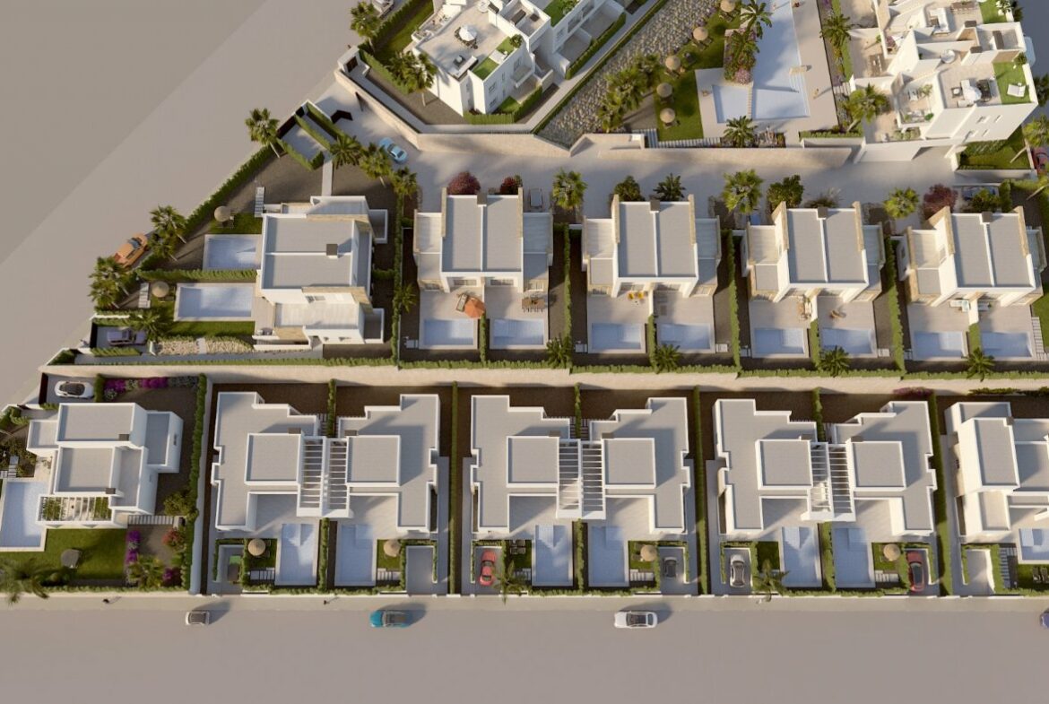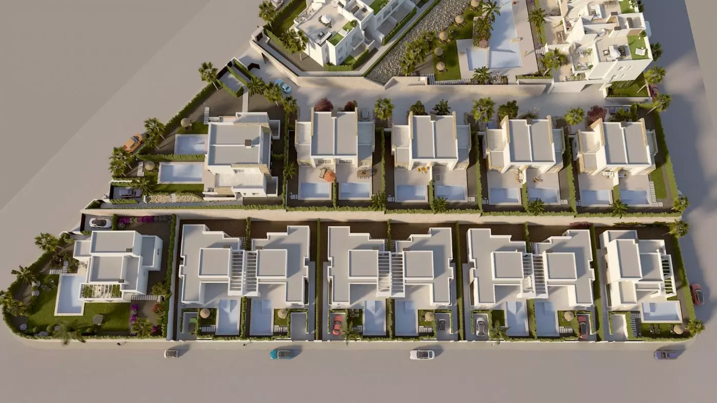 The villas in this complex include three bedrooms and two bathrooms, designed with an open-plan layout that combines the kitchen and living room. Each villa also features a terrace, a private garden, a swimming pool, and designated parking space. The properties come equipped with essential amenities, including air conditioning via ducts, underfloor heating, and shower screens in the bathrooms. The master bedroom includes a walk-in closet for additional storage space.