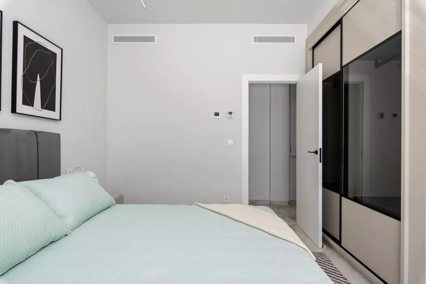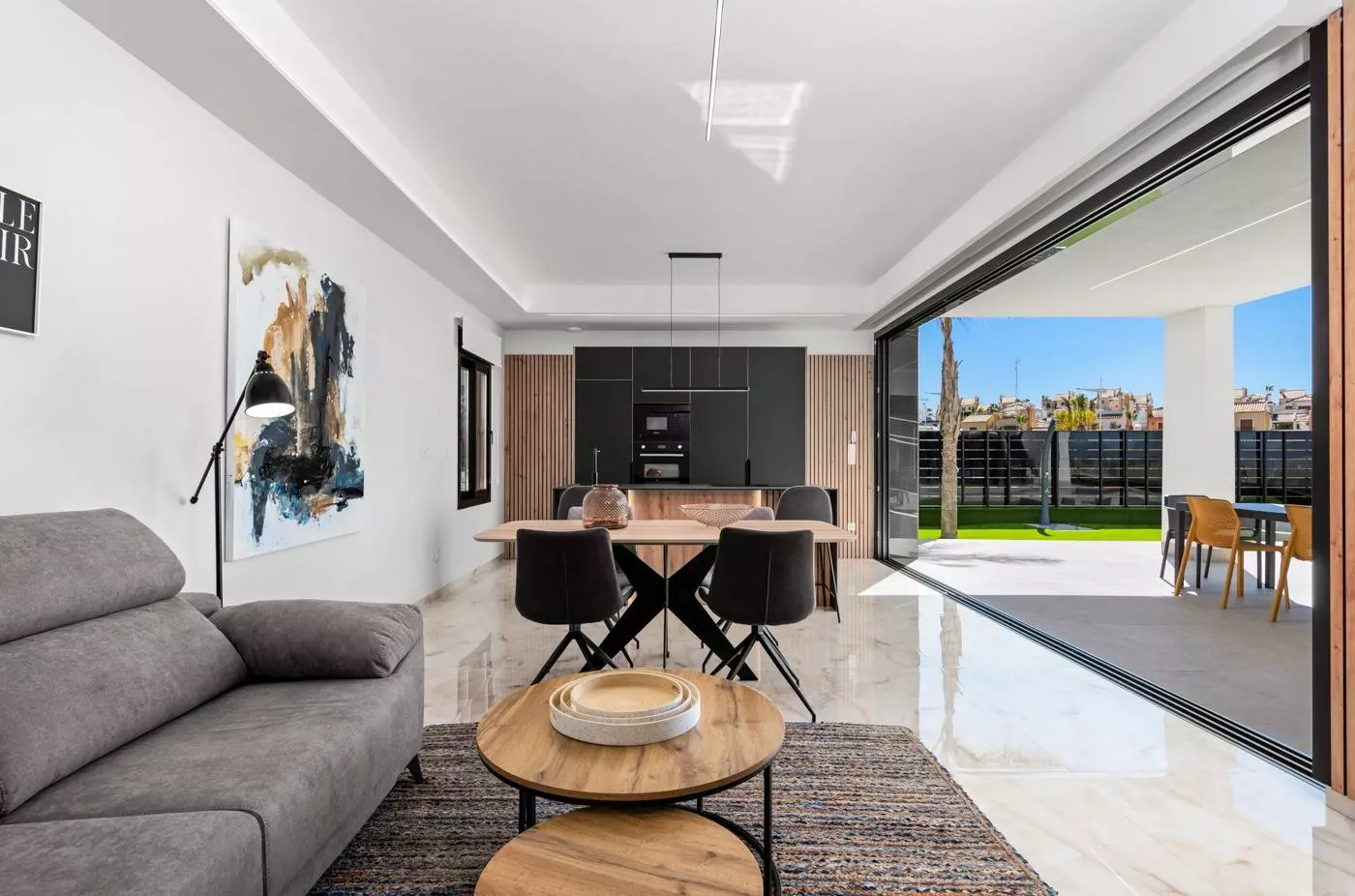 The villas are constructed over a single floor and offer 3 bedrooms and 2 bathrooms, providing ample space for families or individuals looking for room to grow. The open plan kitchen flows seamlessly into the living room, which boasts open views to the terrace. This design allows for easy movement between spaces, making it ideal for casual living.
