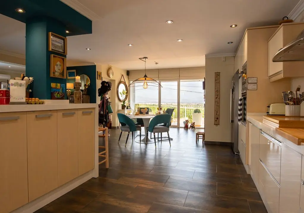 This villa features impressive views of the surrounding orange and lemon groves, enhancing the outdoor experience. Upon entering the property, you will find a large open-plan kitchen and dining area, complemented by a convenient downstairs bathroom. The layout is designed to optimize space while offering functionality.