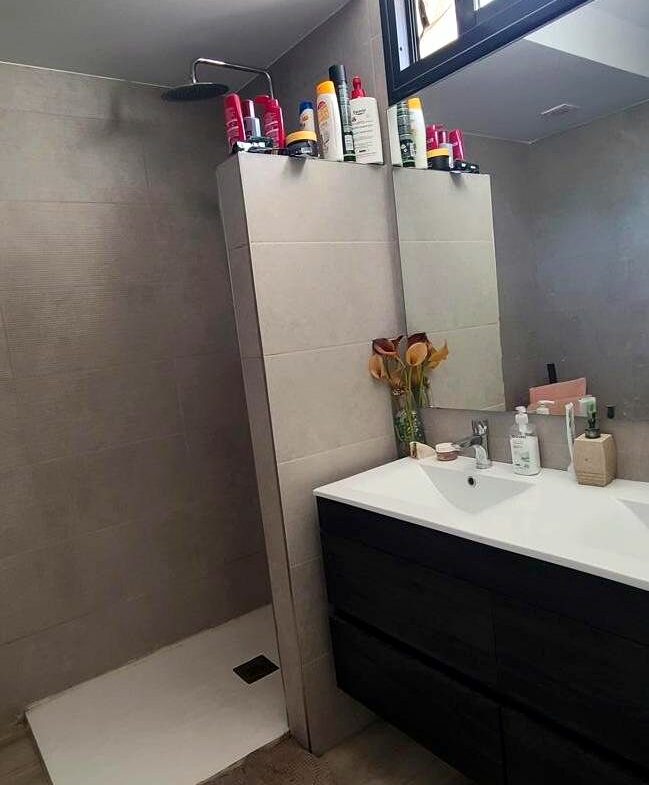 On the ground floor, you’ll find a spacious living-dining area with an open-plan kitchen that comes equipped and furnished. This level also has a bedroom and a bathroom with a shower. From the living area, there is direct access to the private garden, which features a gate leading to the community pool.