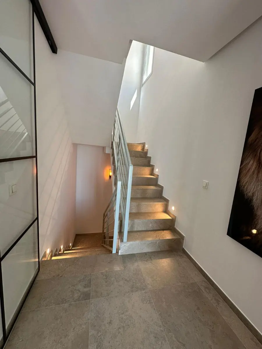 Every aspect of the villa showcases quality. Fully electric shutters and sunshades complement a state-of-the-art heating system. Additionally, a modern water purification system provides pure drinking water throughout the residence. All materials, including flooring, woodwork, and sanitary ware, have been carefully selected and integrated to maintain a cohesive design.