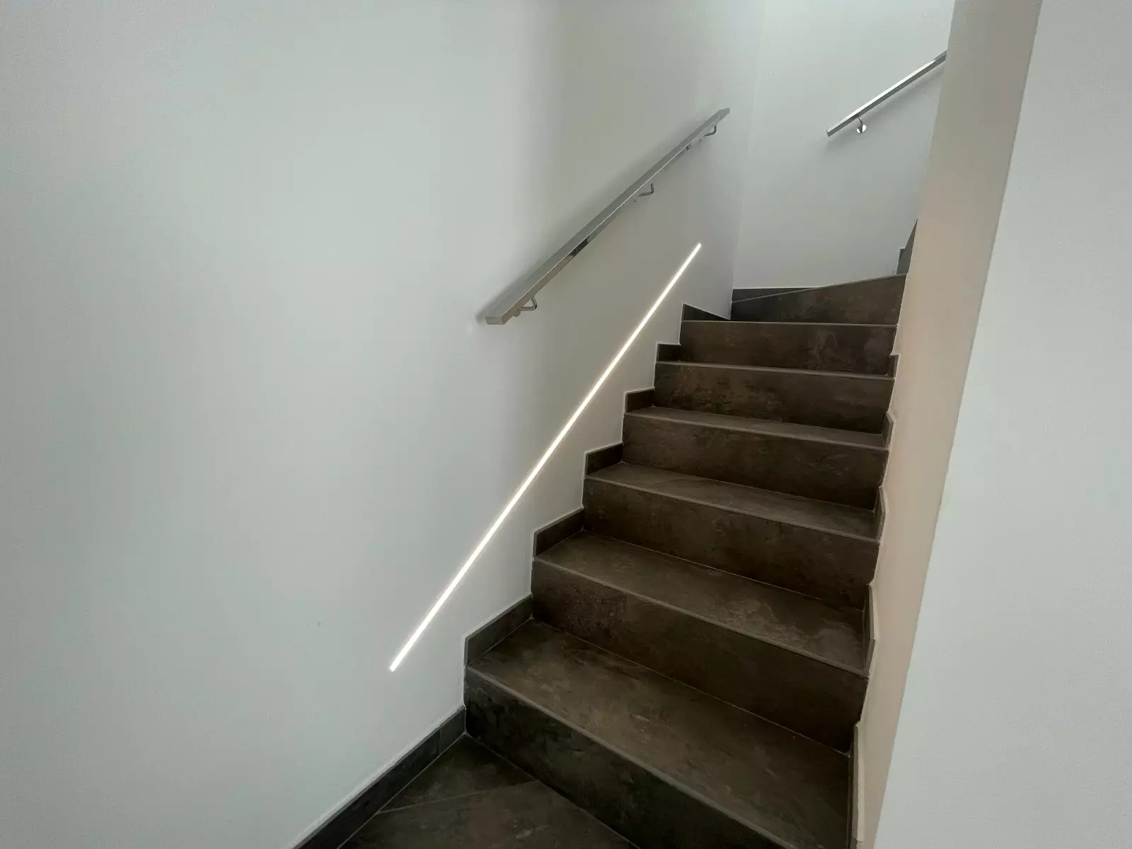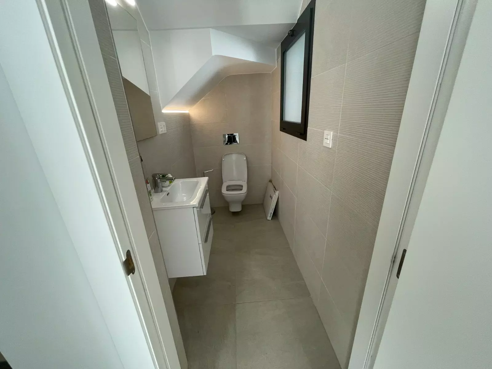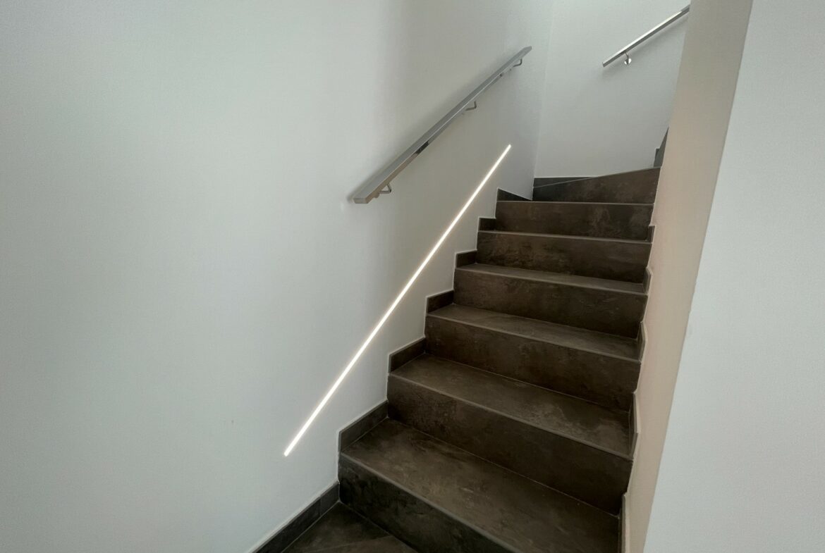 Access to the upper floor is via a stairway accentuated with LED lighting, leading to two double bedrooms. This floor features a large bathroom, also with a shower. Notably, there is a terrace connecting to the solarium which allows for panoramic views of the mountains and the surrounding countryside, providing a unique outdoor space.