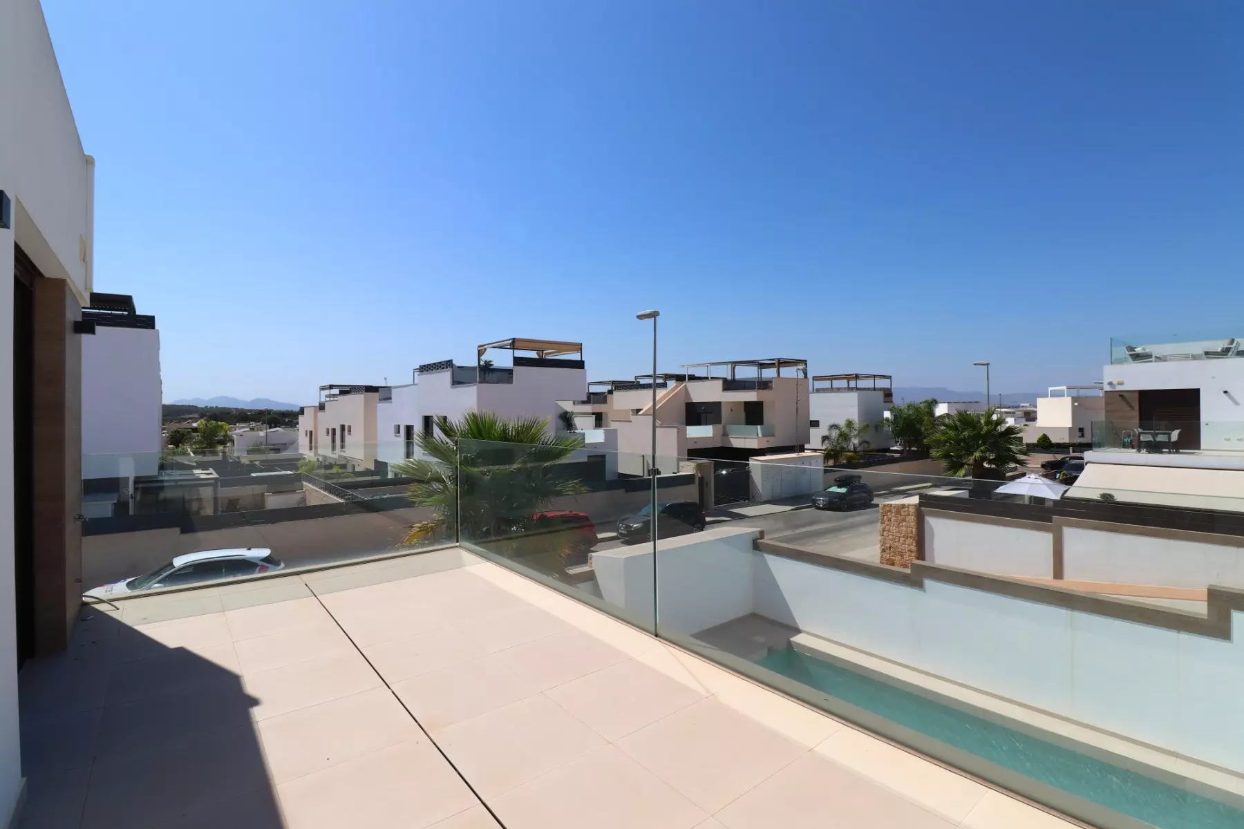 This Corner, Modern & Stylish, As New As, Three Bedroom Detached Villa in Benijofar is located in the heart of this bustling and traditional Spanish town, between Ciudad Quesada and Rojales. Situated within a few minutes walk of many of the amenities and facilities on offer, with everything you could possibly need, whilst the nearest beaches and sea fronts are only a 12 minute drive away at Guardamar del Segura. This property built in 2022, comprises on the ground floor of an open plan fully fitted kitchen with breakfast bar; living/dining room with access out to the front, tiled, beautiful, low maintenance garden with off road parking & private swimming pool; one double bedroom; and a family shower room; on the first floor there are a further two double bedrooms, the master with access out to the large terrace, as well as the landing; and a second shower room, with Juliette access. Internal stairs lead down to the extremely spacious and included under build with lots of possibilities for additional storage, living accommodation, games room, cinema room, etc…, already benefiting from a installations & utility room. Many extras are to include fitted wardrobes, air conditioning throughout, electric blinds, aerothermic system, private pool, parking, motorized gate, internal and external lighting, finished under build, white goods and a super cool finished product. Simply Amazing, available at €440.000! 48 hours notice required for viewings.