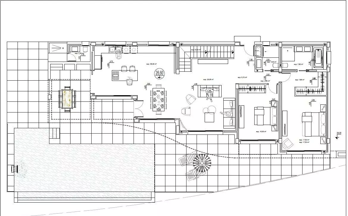 The outdoor space is designed for enjoyment and includes a terrace with a swimming pool and a dedicated barbecue area. This setup allows for engaging outdoor gatherings, all while taking in the beautiful sea views. The terrace provides ample space to enjoy the Mediterranean climate.