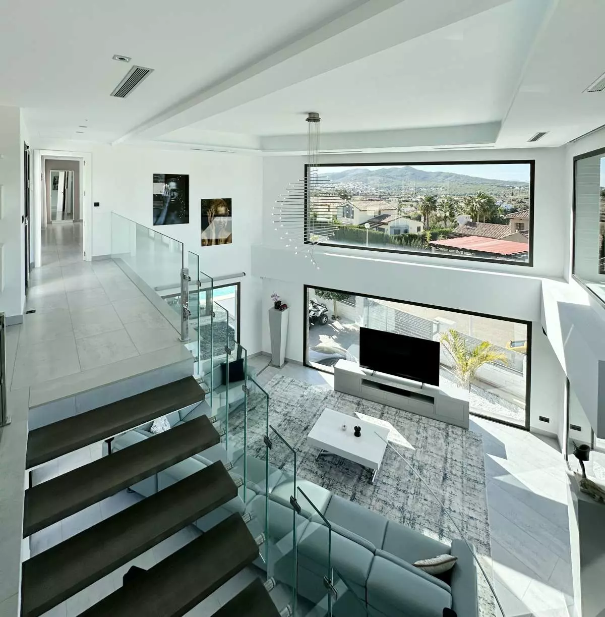 Step into a vast 525-square-meter structure where modern design integrates seamlessly with practical living. This residence spans three levels, creating an expansive environment for daily life. The open-concept living room features floor-to-ceiling windows that bring natural light indoors, enhancing the overall atmosphere of the home. A visually striking floating staircase, accompanied by glass balustrades, serves as a central design element, linking the various floors with ease.