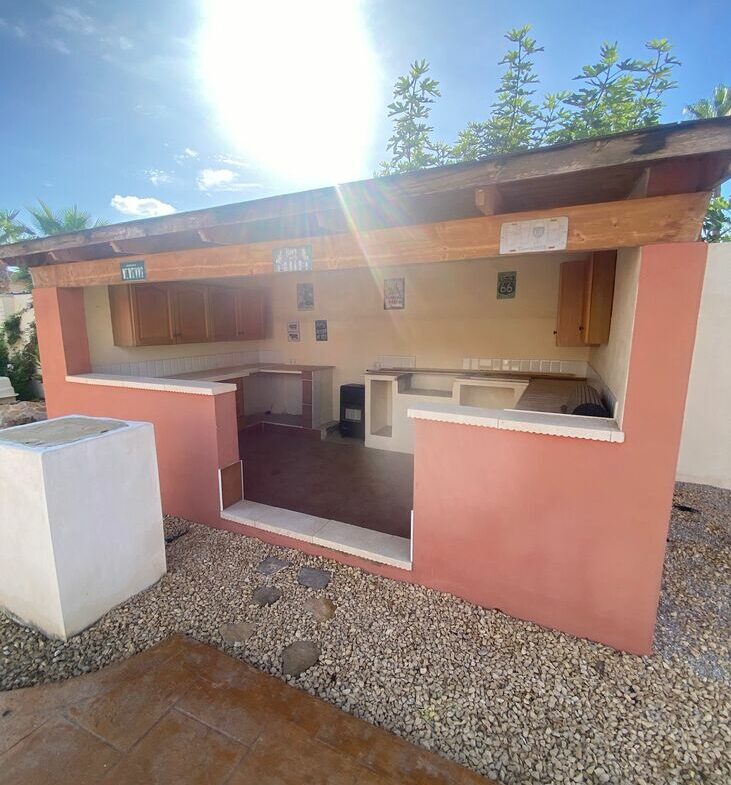 The outdoor area of this villa stands out with its private 8×4 meter swimming pool, surrounded by ample space for sunbathing. This is a perfect spot for entertaining guests or simply enjoying the sunny weather. An outdoor kitchen complements the space, making it convenient to host barbecues or casual gatherings.