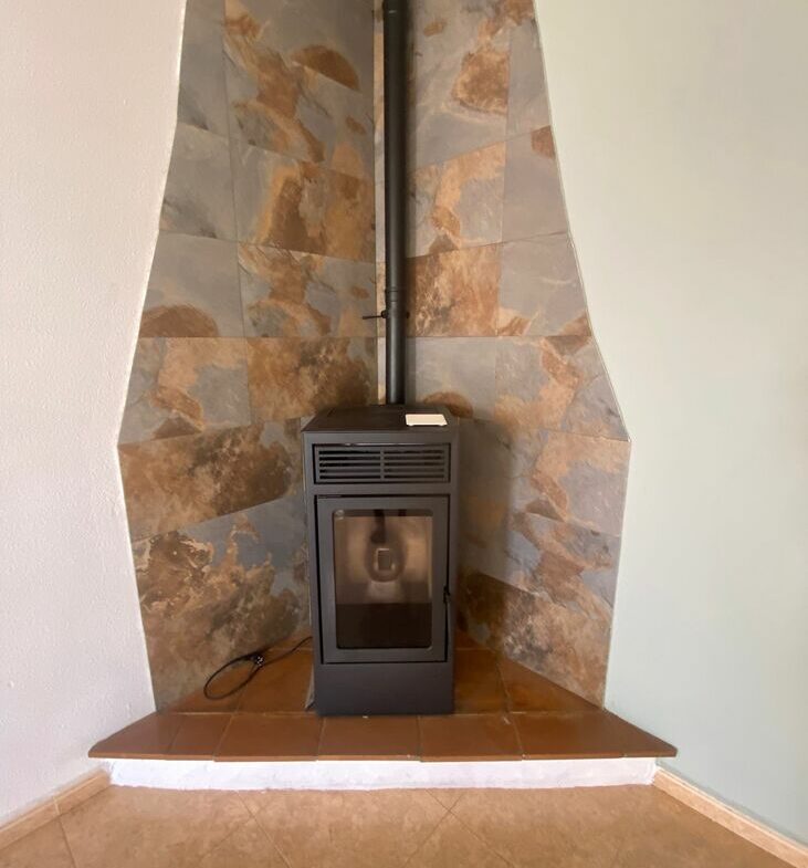 Step inside, and you will find a large and bright living room. This area comes with a log burner which adds a practical element for cooler months. The patio doors lead directly to the pool area, promoting easy access to the outdoor space.