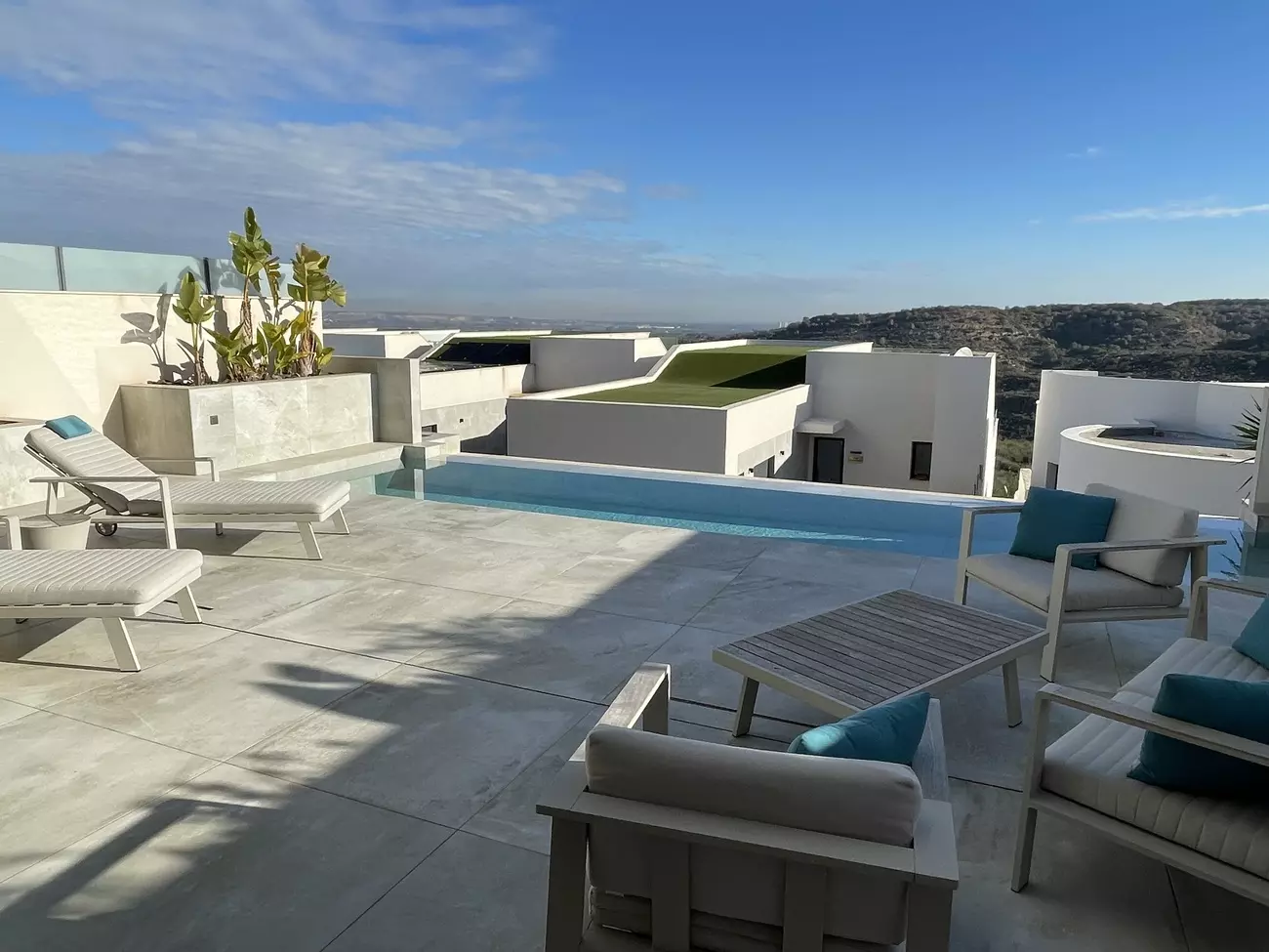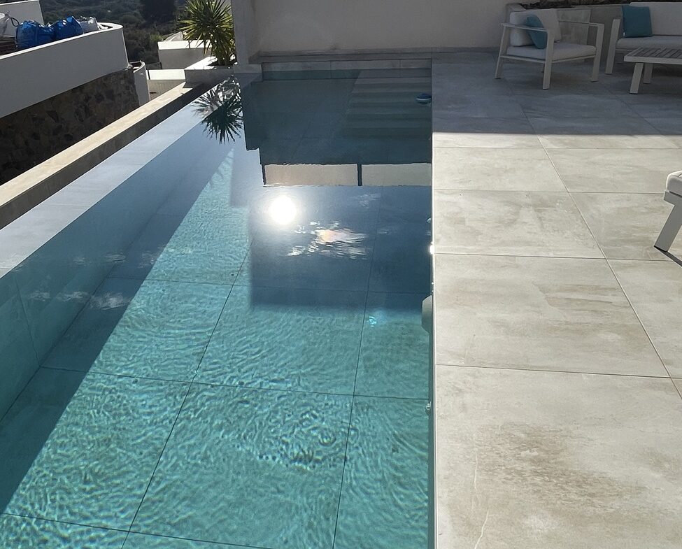 Step inside to a spacious living area featuring an open-plan kitchen that flows into a large terrace. This area is designed for seamless indoor-outdoor living, perfect for gatherings or simply appreciating the stunning views. The large infinity pool invites relaxation and serves as a focal point for outdoor activities.