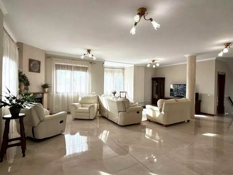 The main floor includes a spacious sitting room equipped with a fireplace. Adjacent to this space is a living room and a dining area, creating a seamless flow for everyday living or entertaining. The large independent kitchen is fully equipped with essential appliances and offers access to both the barbecue area and the garden. Additionally, a bathroom completes this level.