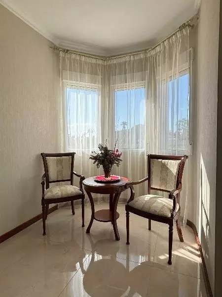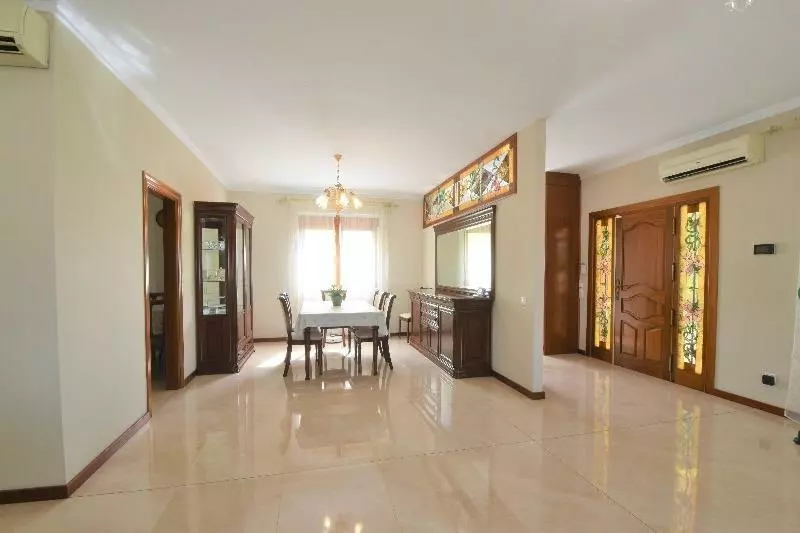 Ascending the marble staircase, the upper floor features three double bedrooms, a study that has the potential to be converted into an additional bedroom, and two bathrooms—one of which is en-suite, complete with a whirlpool bath in the master bedroom. From the bedrooms, a sizable terrace provides views of the park and surrounding landscape, offering an opportunity for relaxation outdoors.