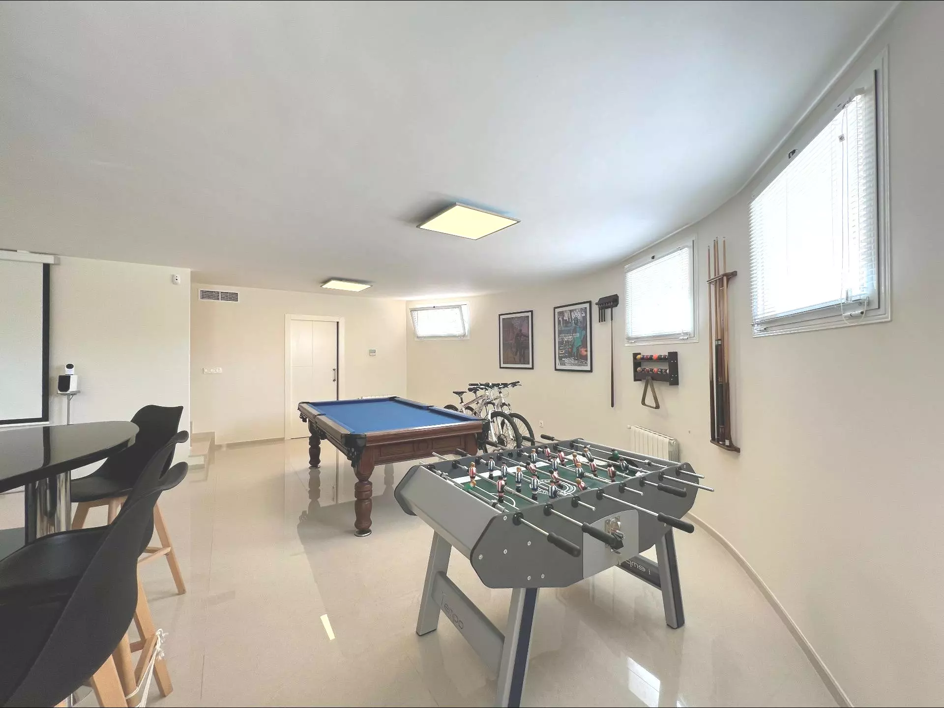In addition to the living space, the basement is equipped with an entertainment area. This includes a pool table, foosball, and a private cinema room, providing various options for leisure and gatherings. These features appeal to those who enjoy hosting events or family movie nights.