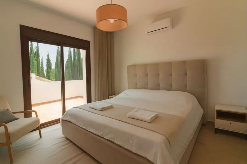 The main house is distributed over two levels and is in good condition, fully habitable from day one. It currently comprises three bedrooms, including a master suite with a fireplace, marble floors, a bright living room with a fireplace, a fitted kitchen, and well-utilised interior spaces. The villa also features a basement, utility room, and a private garage with parking for two vehicles.