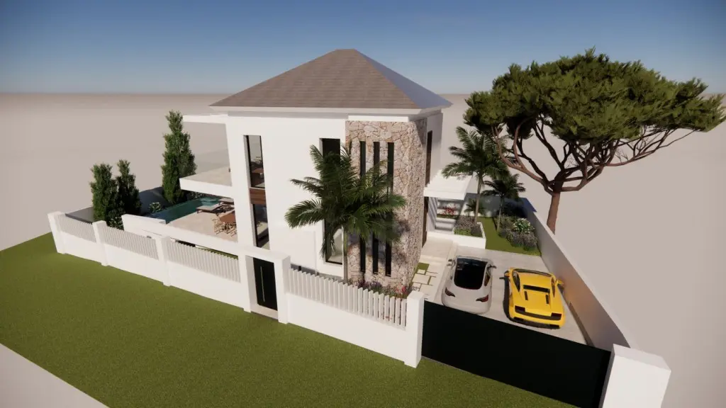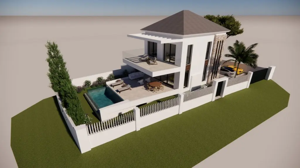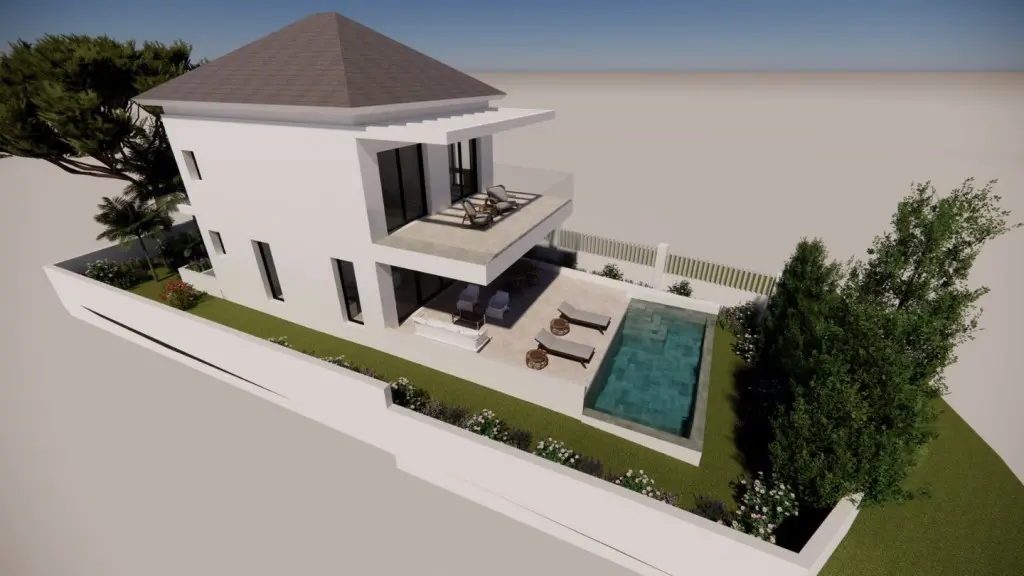The villa comprises 380 m² built (312 m² usable) distributed across four spacious bedrooms and five bathrooms, all designed with natural light and sea views in mind. The elegant living area opens onto a covered terrace, private garden, and swimming pool, creating seamless indoor-outdoor living.