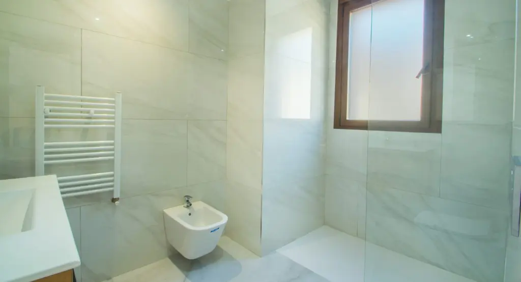 The bathrooms are equipped with shower plates and top-quality porcelain tiles that enhance the overall aesthetic. Additional features include pre-installation for air conditioning, which allows for easy cooling during the hotter months. These details contribute to an efficient and comfortable living environment.
