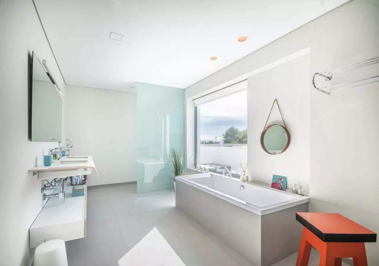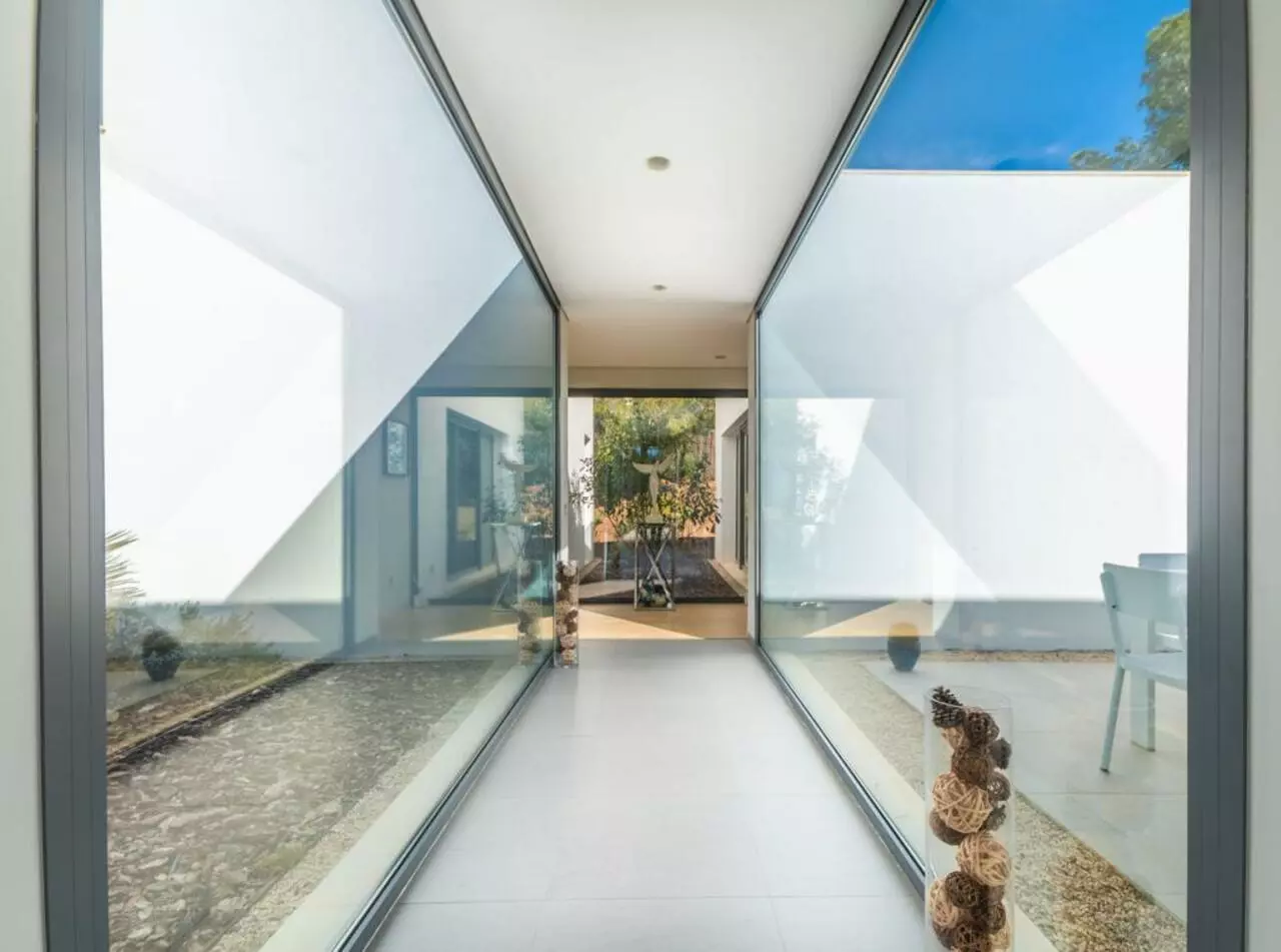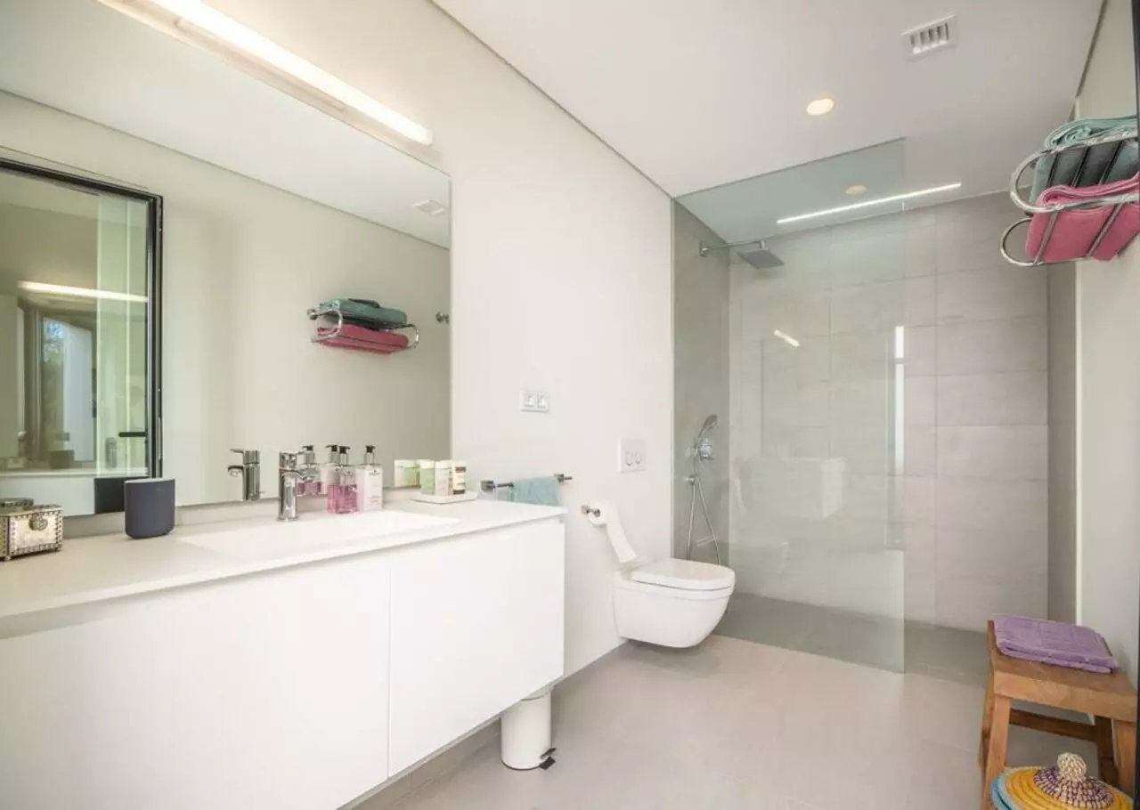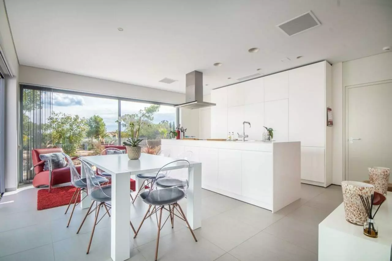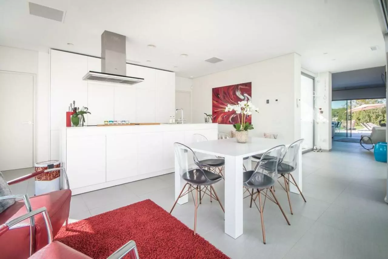 This modern villa is well-organized, featuring four distinct areas connected by a spacious hallway adorned with large windows. One section houses an open-plan kitchen and dining area, along with a designated storage and washing room. To enhance guest convenience, a small restroom is also available in this area.