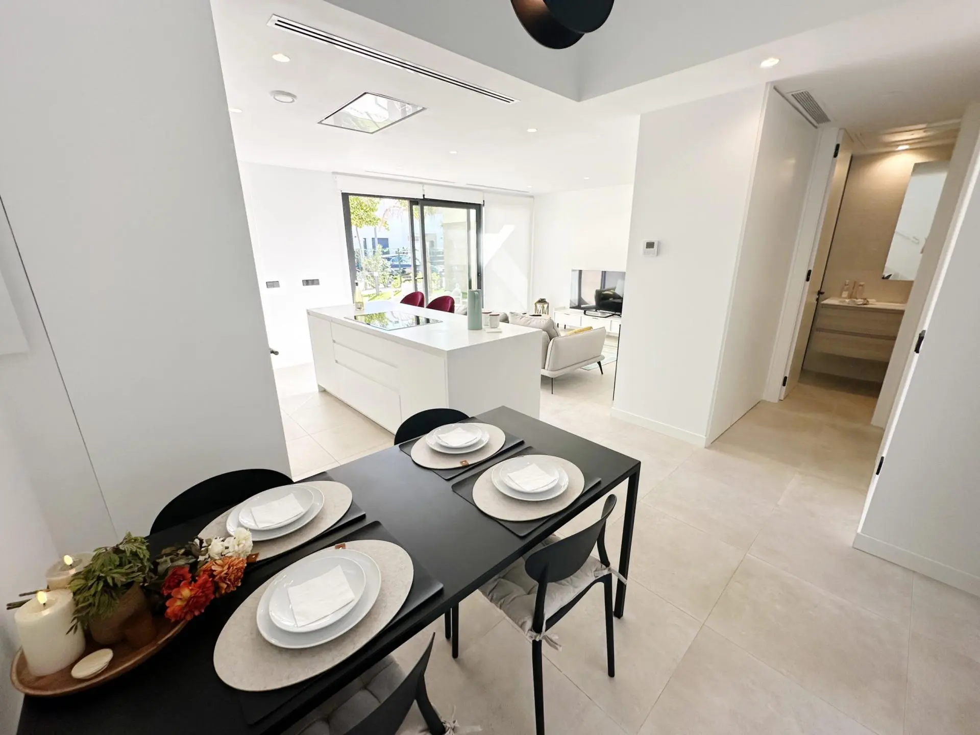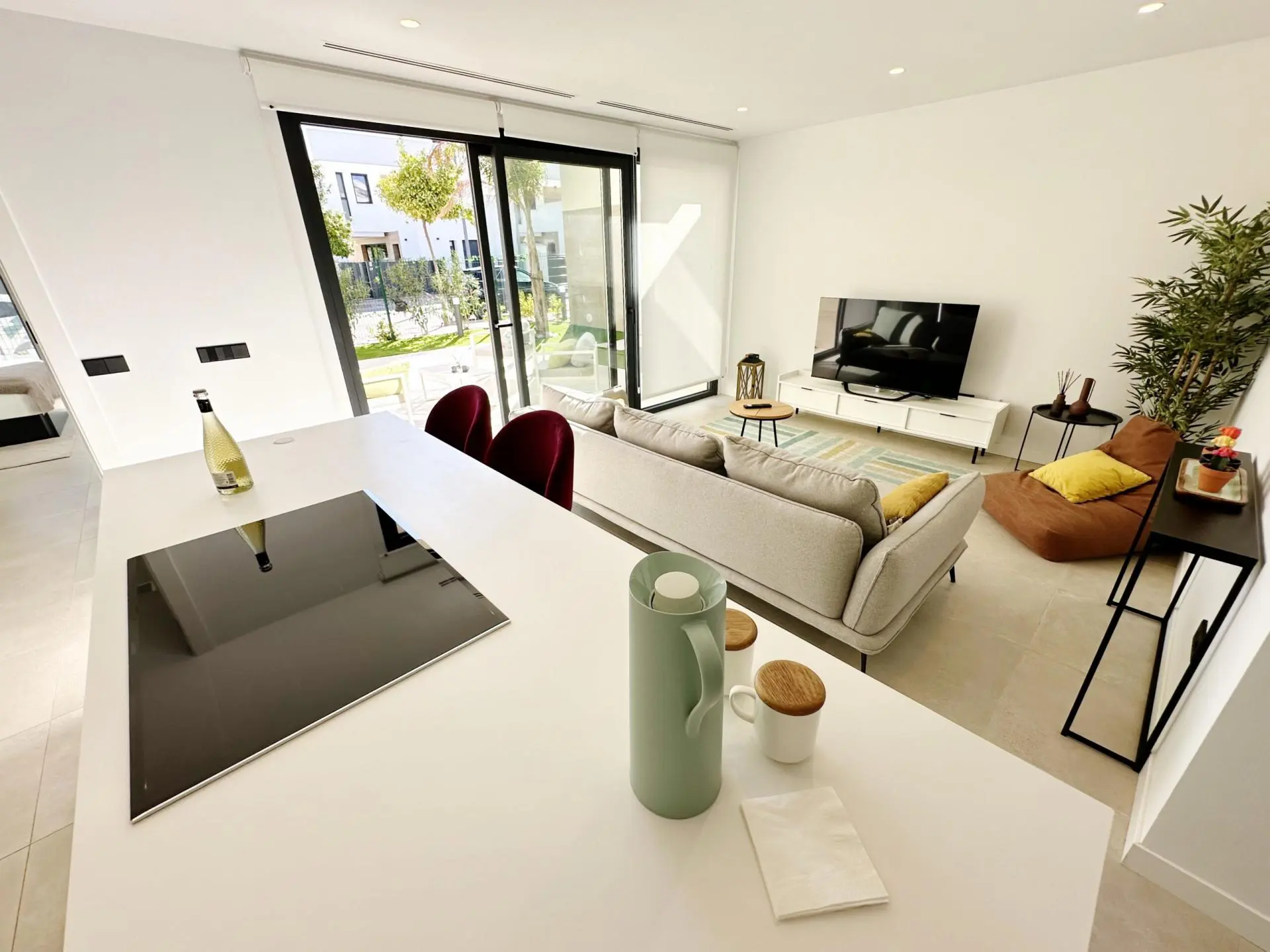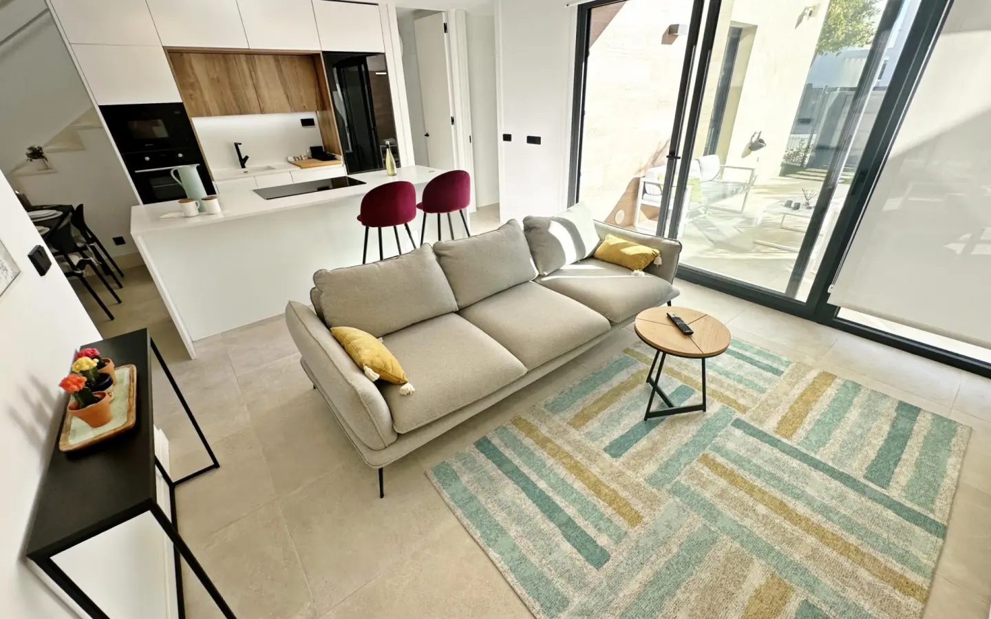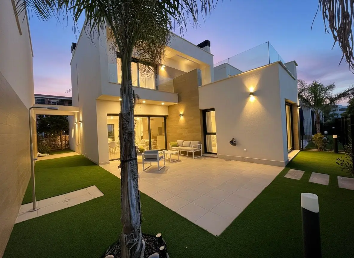 This beautifully designed villa features its own private driveway with convenient parking. There is the option to install a jacuzzi or swimming pool, allowing you to create a private outdoor relaxation area. The terrace adjoining the living room has been carefully designed to offer a peaceful, secluded space for relaxation. The villas themselves have been conceived with comfort, tranquillity and privacy in mind. Ideally located, the property is just a two-minute walk from the impressive lagoon and beach areas within Santa Rosalía Lake and Life Resort. The charming town of Los Alcázares and the beaches of the Mar Menor are only a five-minute drive away, offering a variety of popular Spanish restaurants such as Tropical and Encarnación. Inside, the home impresses with a wonderful sense of space and natural light – the dining area benefits from a double-height ceiling, while the lounge opens through large patio doors onto the terrace and garden. The modern kitchen includes a generous island with a breakfast bar and high-quality appliances. On this level there is also a practical utility room with a boiler and washing machine. The ground floor features a double bedroom with an en-suite bathroom and direct access to the garden, a second double bedroom with patio doors leading to the rear terrace, and a stylish family bathroom. The hallway also includes a useful built-in wardrobe providing additional storage space. Upstairs, the master bedroom offers a walk-in wardrobe, an en-suite bathroom and its own private terrace. From this floor there is access to a spacious south-facing terrace, shared between the master suite and the hallway. The villa is equipped with a solar installation for domestic hot water and 5 kW photovoltaic panels, significantly reducing energy costs. The Airzone system allows independent temperature control in each room – for both heating and cooling – ensuring year-round comfort. The kitchen features an elegant island finished with premium Porcelanosa – Krion worktop, made of a modern, durable and hygienic material inspired by natural stone. This worktop was added as an additional feature at the owners’ request. The interior has been carefully arranged with attention to material consistency and fine details. Wall-mounted lights in the bedrooms and the living-room pendant lamp were added at the owners’ request, reflecting a modern Spanish style with a subtly raw, stone-inspired character – resulting in a balanced and elegant atmosphere throughout. The property is sold fully furnished, has an A-class energy rating, Airzone climate control, an outdoor shower in the garden, and the option for quick completion – with no need to wait for a new construction phase.