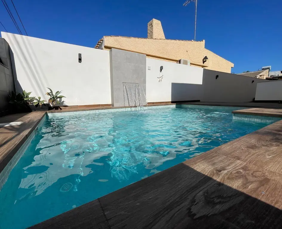 Entering through a secure gate, you will find a private tiled terrace leading to a swimming pool complete with an outdoor shower. This setup is favorable for those hot summer days when cooling off is a priority. The outdoor barbecue area, equipped with a built-in sink, sets the stage for outdoor dining, presenting a functional space for gatherings.