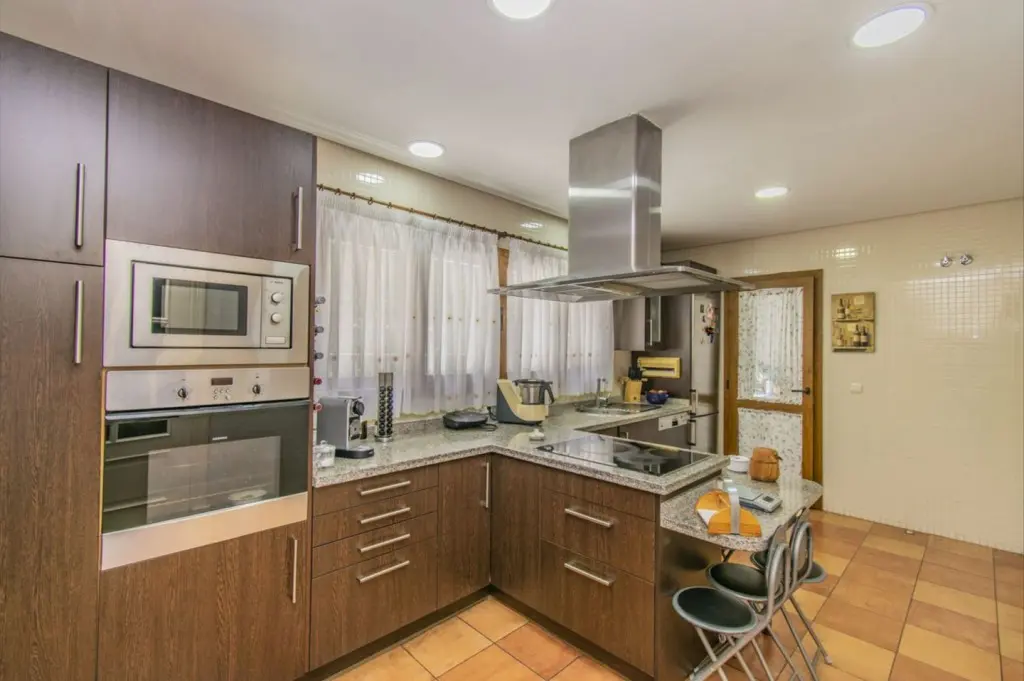 The villa is distributed over two floors plus a spacious basement, providing a total of five bedrooms, three bathrooms, and a guest toilet. It features a bright living room with a fireplace, a large independent kitchen, and a garage with capacity for several vehicles. The basement adds valuable additional space, ideal for storage or multifunctional use.