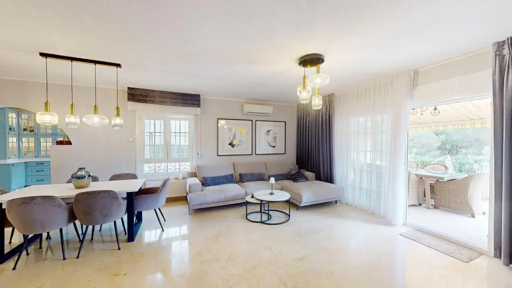 The first floor introduces you to a living room that opens onto a terrace. This area presents panoramic views of the golf course and your private swimming pool. The independent kitchen is functional and includes a laundry room, two bedrooms, a bathroom, and a storage room. All these amenities ensure a practical layout for daily living.