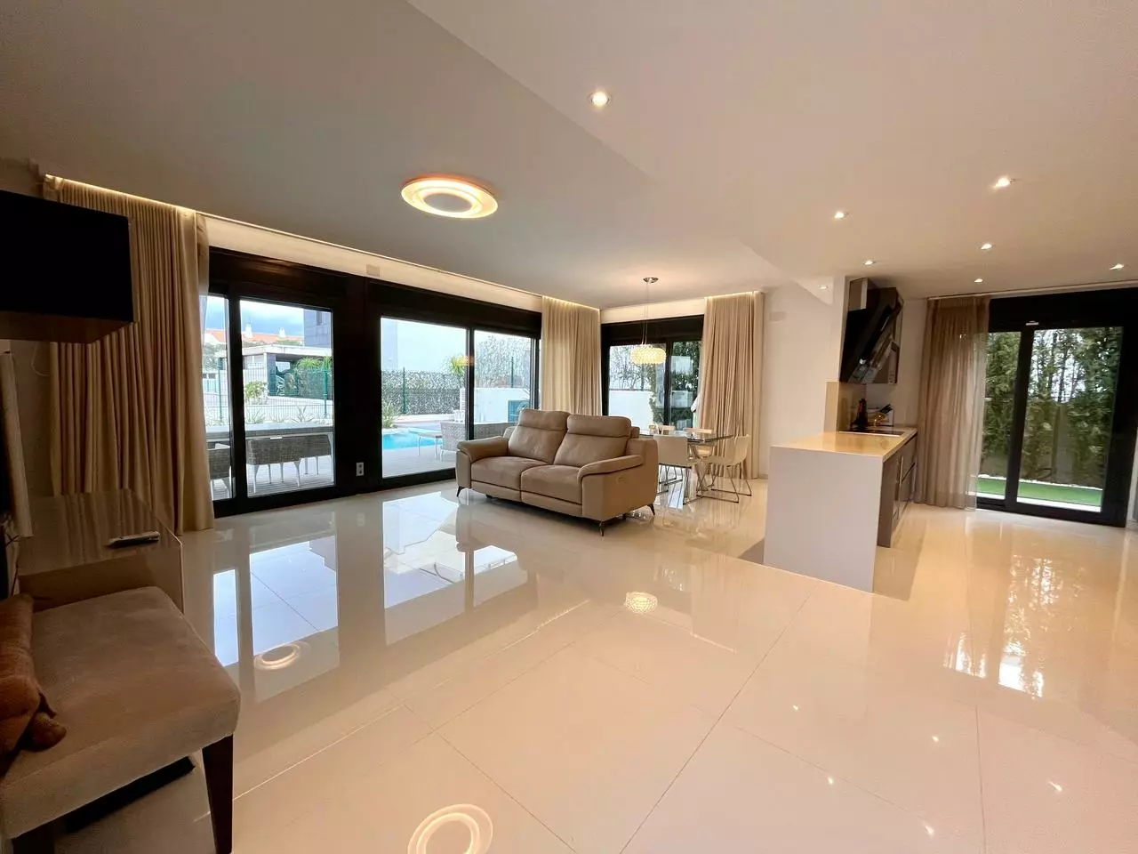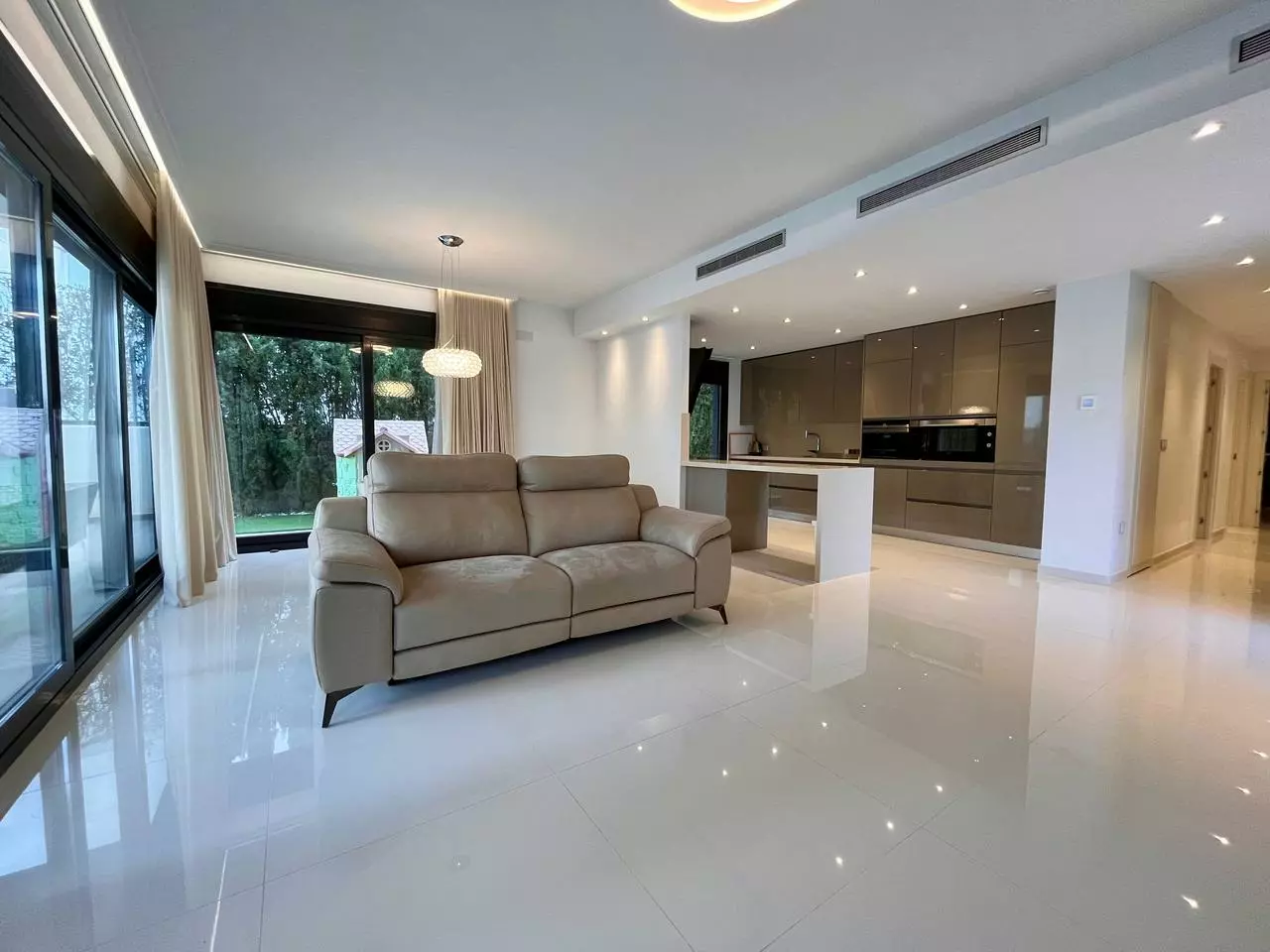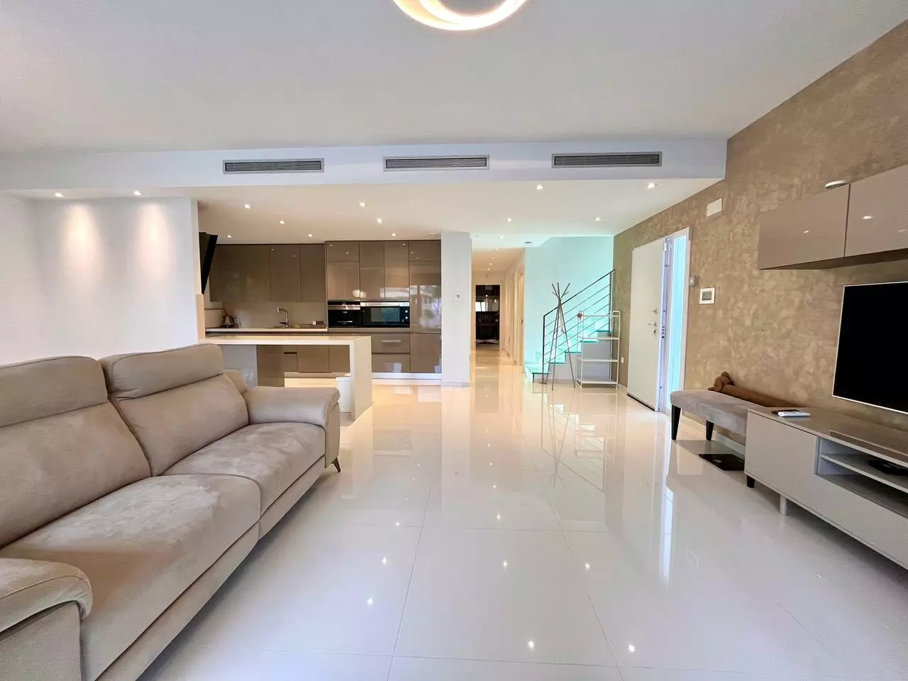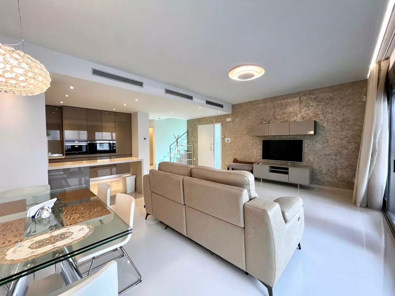 The open-plan kitchen comes fully furnished, making it ready for immediate use. Each room in the villa is equipped with air conditioning, ensuring a comfortable environment year-round. This thoughtful design highlights convenience, catering to a variety of lifestyles.